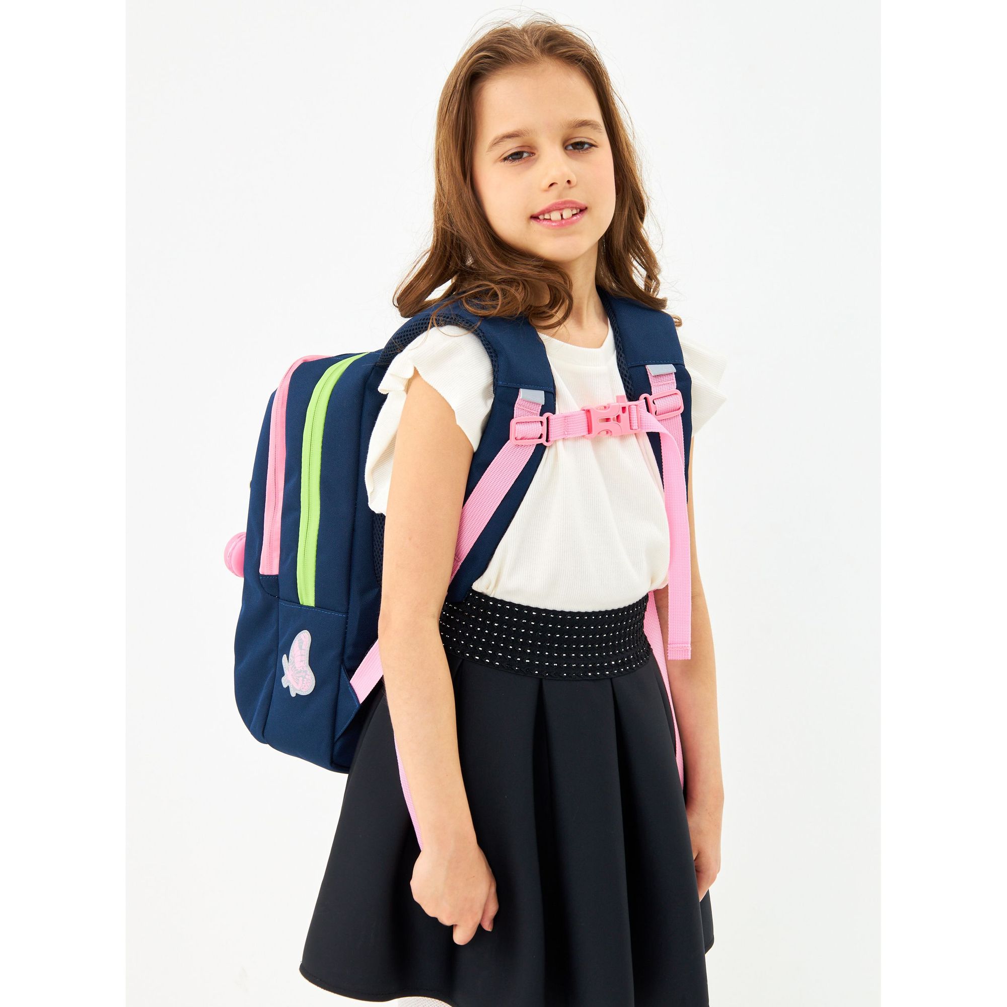 Чтобы снизить нагрузку на спину и плечи при полной загрузке, сделали укрепленную спинку, широкие лямки и нагрудную стяжку-фиксатор. У девочек сохраняется правильная осанка. А для безопасного передвижения в вечернее время, мы со всех сторон сделали отражатели, которые в свете фар точно заметят.