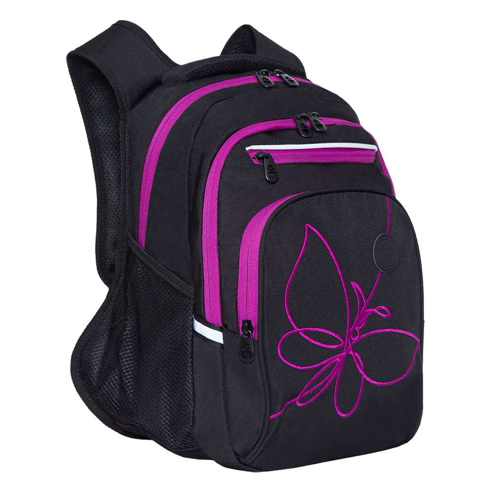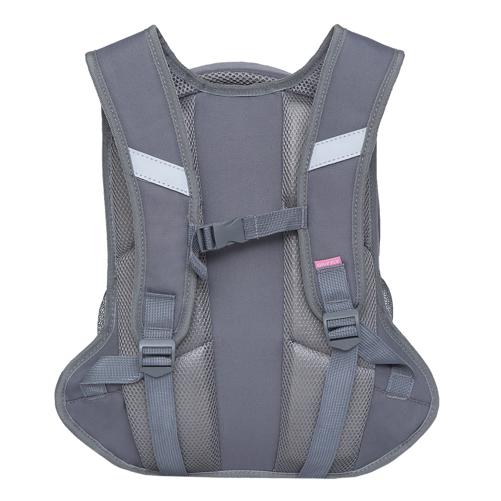 Рюкзак разработан для учащихся начальной и средней школы. Анатомическая спинка, удобные лямки и нагрудная стяжка-фиксатор позволяют равномерно распределять нагрузку на спину и плечи. Материал рюкзака с водо- и грязеотталкивающей пропиткой.  Рюкзак очень хорошо оснащен, имеет два вместительных отделения для учебных пособий форматом А4. В основном отделении есть карман для планшета или небольшого ноутбука 13". Дополнительное переднее отделение оснащено съемным держателем для ключей и тремя карманами. Двунаправленные реверсные молнии с брендированными пуллерами на замках позволяют легко открывать и закрывать рюкзак. У рюкзака два внешних кармана на молнии, удобная ручка для переноски и два боковых кармана для бутылочки с водой. Светоотражающие элементы с 4-х сторон обеспечивают дополнительную безопасность. К рюкзаку прилагается обучающая брошюра по программе «GRIZZLY Здоровая Спина».