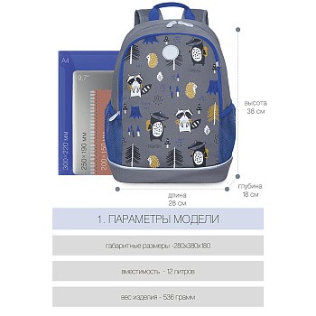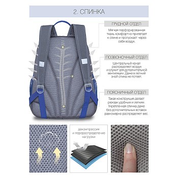 Рюкзак разработан для учащихся начальной и средней школы. Жесткая спинка и удобные лямки позволяют равномерно распределять нагрузку на спину и плечи. Материал рюкзака с водо- и грязеотталкивающей пропиткой. Рюкзак очень легкий, но при этом вместительный. В рюкзаке два отделения для учебных пособий форматом А4. В основном отделении есть карман для планшета или небольшого ноутбука 13". Двунаправленные реверсные молнии с брендированными пуллерами на замках позволяют легко открывать и закрывать рюкзак. У рюкзака удобная ручка для переноски и два боковых кармана для бутылочки с водой и разных мелочей. Светоотражающие элементы с 4-х сторон обеспечивают дополнительную безопасность. К рюкзаку прилагается обучающая брошюра по программе «GRIZZLY Здоровая Спина».