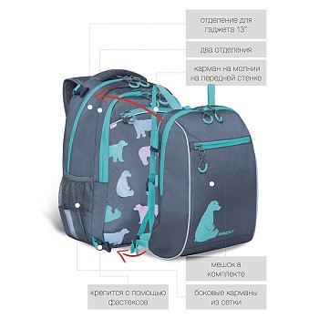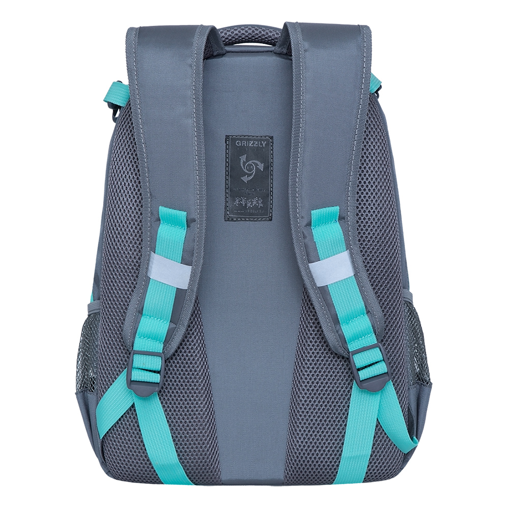 Рюкзак в комплекте с отстегивающимся мешком для обуви или спортивной формы разработан для учащихся начальной и средней школы. Анатомическая спинка и удобные лямки позволяют равномерно распределять нагрузку на спину и плечи. Материал рюкзака с водо- и грязеотталкивающей пропиткой. Рюкзак очень хорошо оснащен, имеет два вместительных отделения для учебных пособий форматом А4. В основном отделении есть карман для планшета или небольшого ноутбука 13". В передний карман на молнии поместится куча мелочей. Двунаправленные реверсные молнии с брендированными пуллерами на замках позволяют легко открывать и закрывать рюкзак. У рюкзака удобная ручка для переноски и два боковых кармана для бутылочки с водой. В комплект входит дополнительный рюкзак-мешок для спортивной формы и сменной обуви, крепиться к рюкзаку специальными карабинами. Светоотражающие элементы с 4-х сторон обеспечивают дополнительную безопасность. К рюкзаку прилагается обучающая брошюра по программе «GRIZZLY Здоровая Спина».