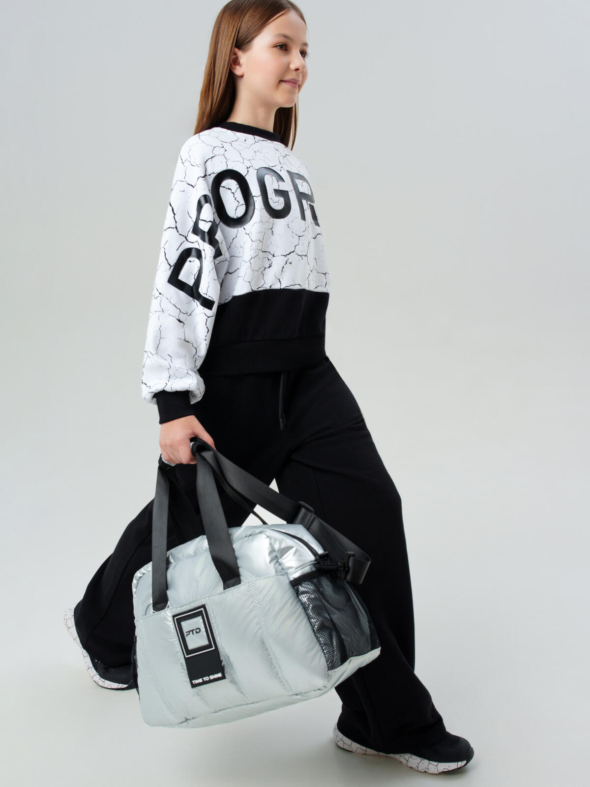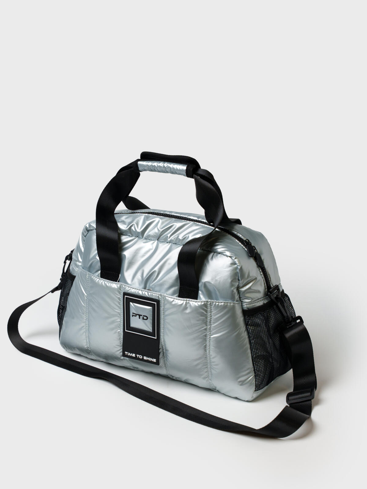 серебряный 100% полиэстер с ПУ покрытием Модная спортивная сумка из серебристой дутой плащевой ткани для девочки подростка. Сумка имеет одно большое отделение с сеткой разделителем и карманом на молнии внутри. Снаружи есть большой карман на кнопке с одной сторону и с другой стороны большой карман на молнии, сбоку имеются карманы из сетки на резинке. Ручки с удобным креплением, плечевой регулируемый ремень. Сумка очень легкая и вместительная. К сумке можно подобрать рюкзак в едином дизайне. Размер мешка 37*32*14 см