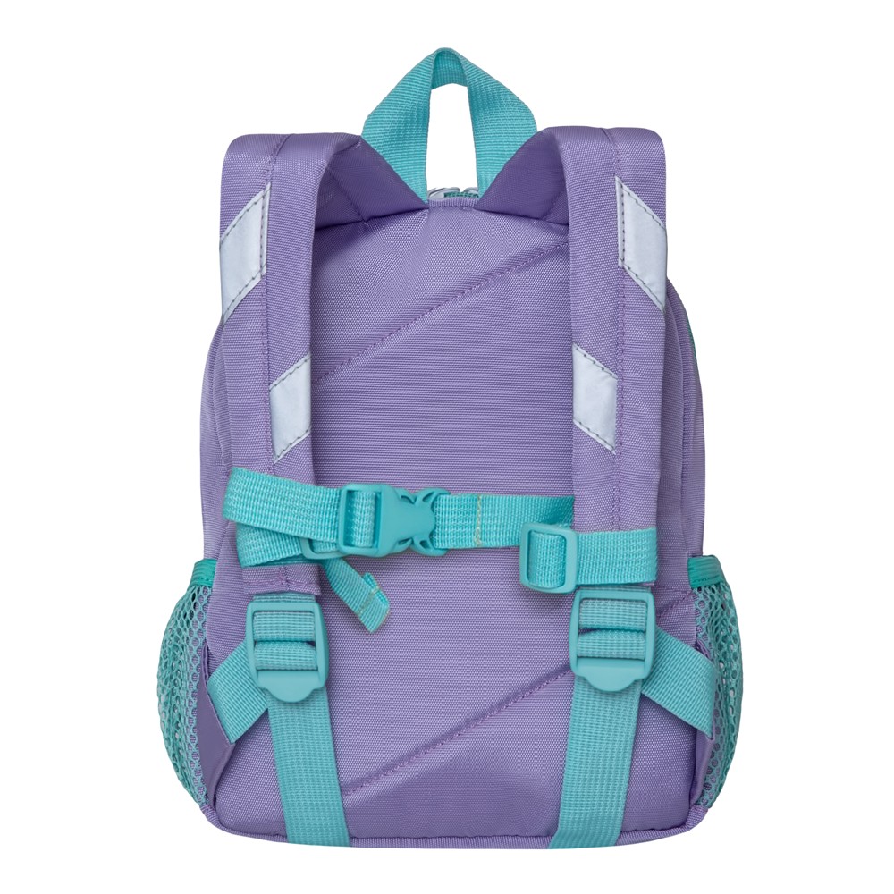 В дошкольном рюкзаке есть объемное основное отделение (с сетчатым кармашком внутри) для блокнотов с карандашами или сменки. Внешний кармашек на молнии для мелочей, а боковые для воды или салфеток. Девочка, как взрослая, все свои вещи носит сама.