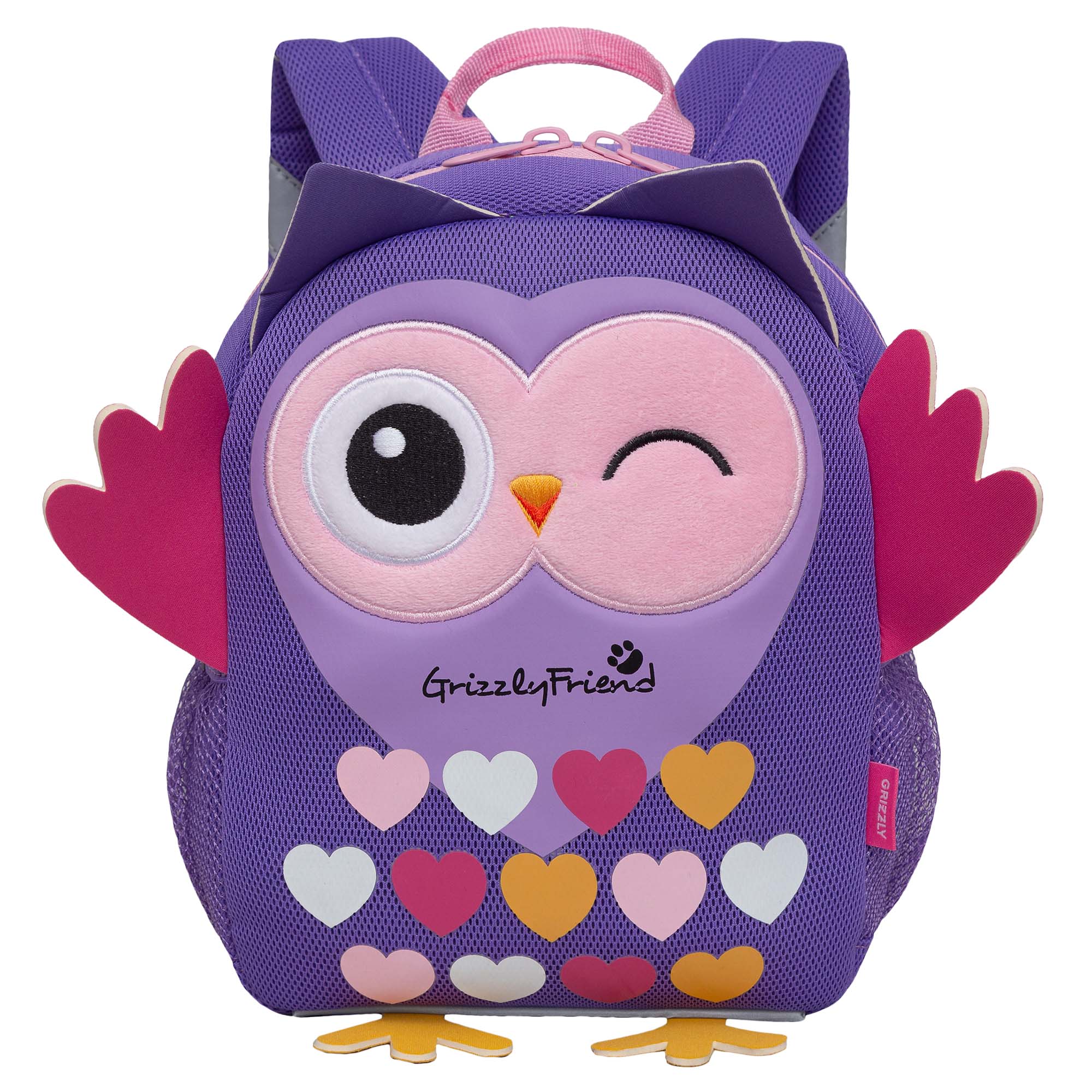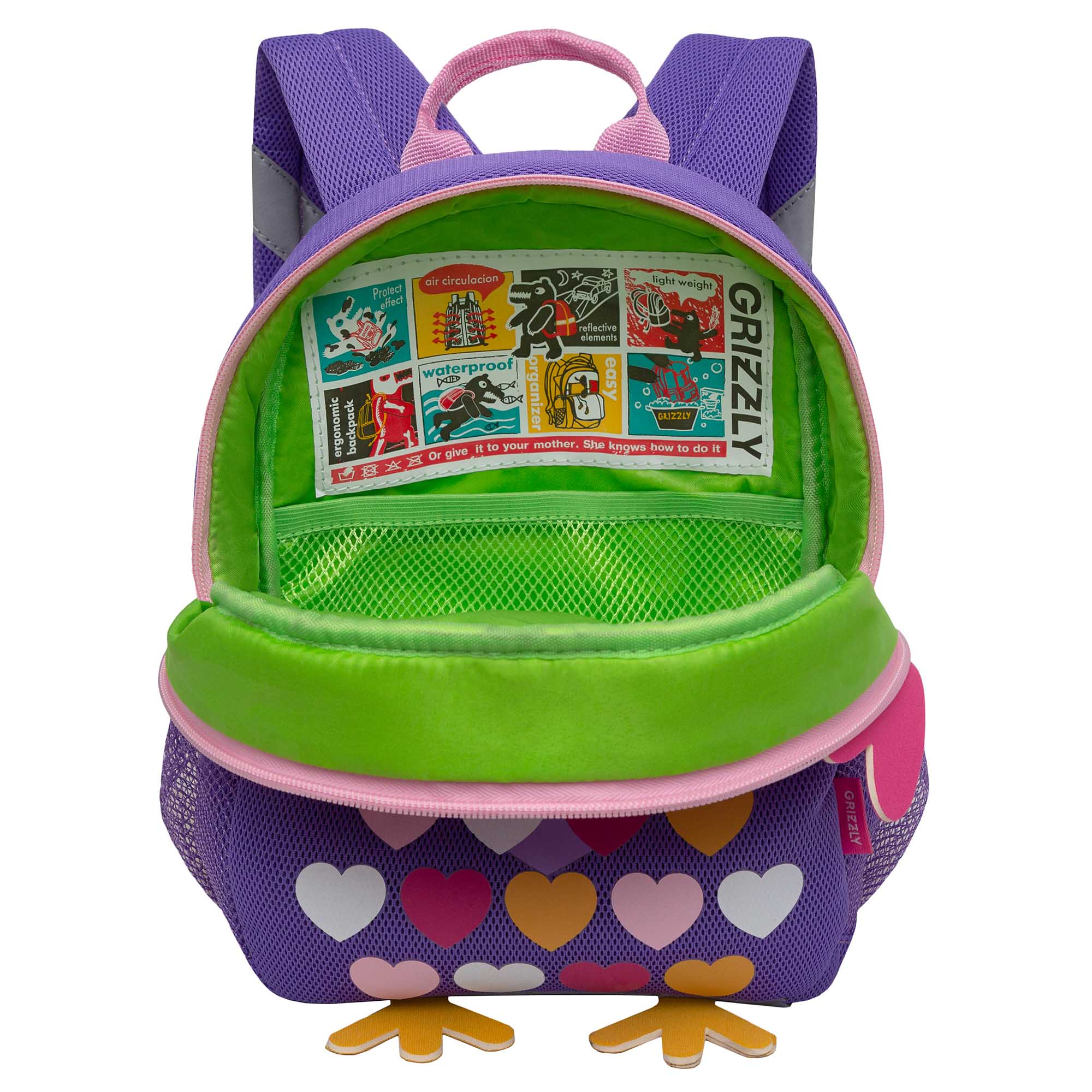 Легкий детский рюкзачок Grizzly наверняка станет верным и незаменимым спутником для Вашего малыша. С таким рюкзачком можно ходить в детский сад, на прогулку, в гости, а можно использовать его в качестве игрушки. У рюкзака одно отделение на молнии, в которое легко поместятся и карандаши, и фломастеры, и небольшой блокнот, и любимая игрушка, а внутренний кармашек из сетки с резиночкой позволит  поддержать порядок внутри рюкзачка. В кармашки сбоку можно положить бутылочку с водой. Есть ручка-петля для переноски. Мягкая спинка, регулируемые лямки и фастекс со свистком делают рюкзачок очень комфортным. Свисток можно использовать как для игры, так и для дополнительной безопасности. Также мы добавили со всех сторон светоотражающие элементы для безопасности в темное время суток. За счет водо- и грязеотталкивающей пропитки он долго остается как новый. Если рюкзак все же чем-то испачкался, мы рекомендуем ручную стирку в холодной воде.