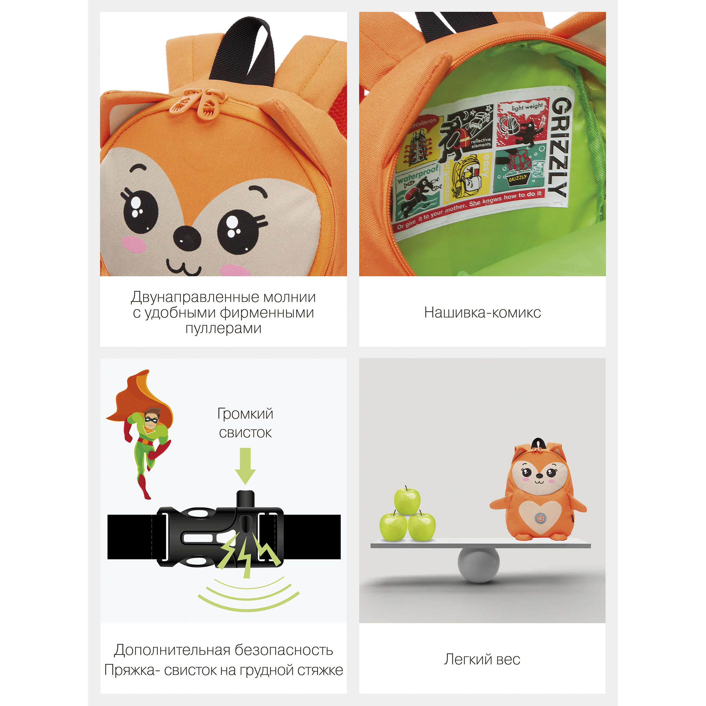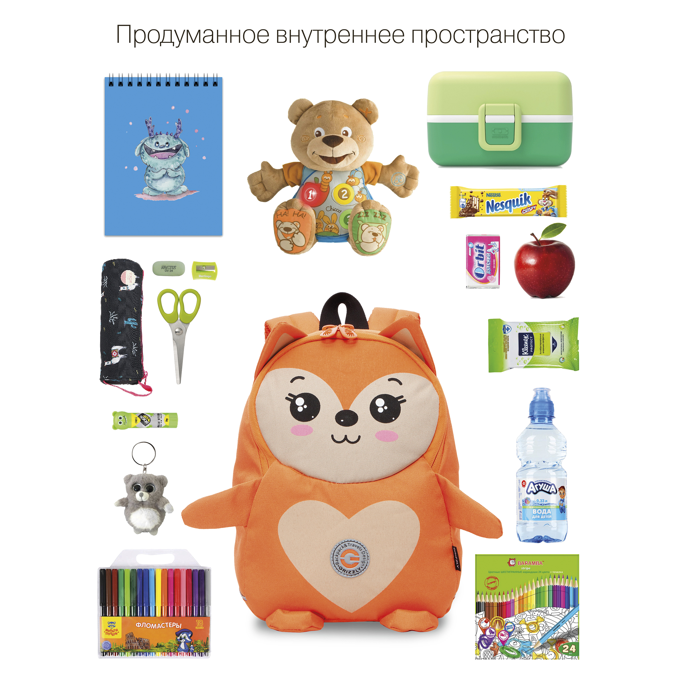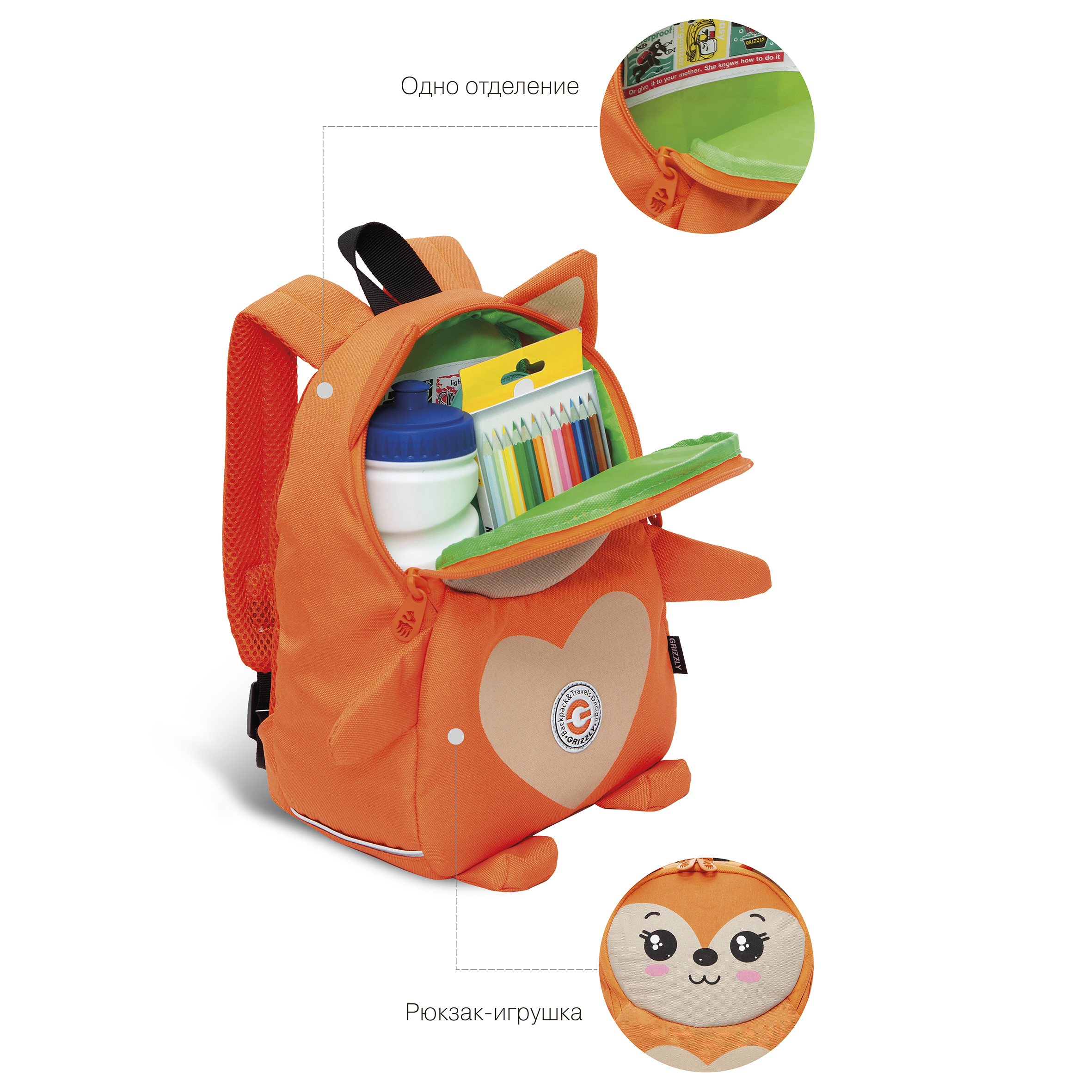 Легкий детский рюкзачок Grizzly наверняка станет верным и незаменимым спутником для Вашего малыша. С таким рюкзачком можно ходить в детский сад, на прогулку, в гости. У рюкзака одно отделение на молнии, в которое легко поместятся и карандаши, и фломастеры, и небольшой блокнот, и любимая игрушка, а внутренний кармашек из сетки с резиночкой позволит  поддержать порядок внутри рюкзачка. В кармашки сбоку можно положить бутылочку с водой. В передний кармашек на молнии, на котором изображен забавный рисунок, малыш может убрать свои самые ценные вещи, и они точно не потеряются. Мягкая спинка и регулируемые лямки делают рюкзачок очень комфортным. Материал с водо- и грязеотталкивающей пропиткой.  Есть ручка-петля для переноски. Рюкзак можно стирать в стиральной машине.