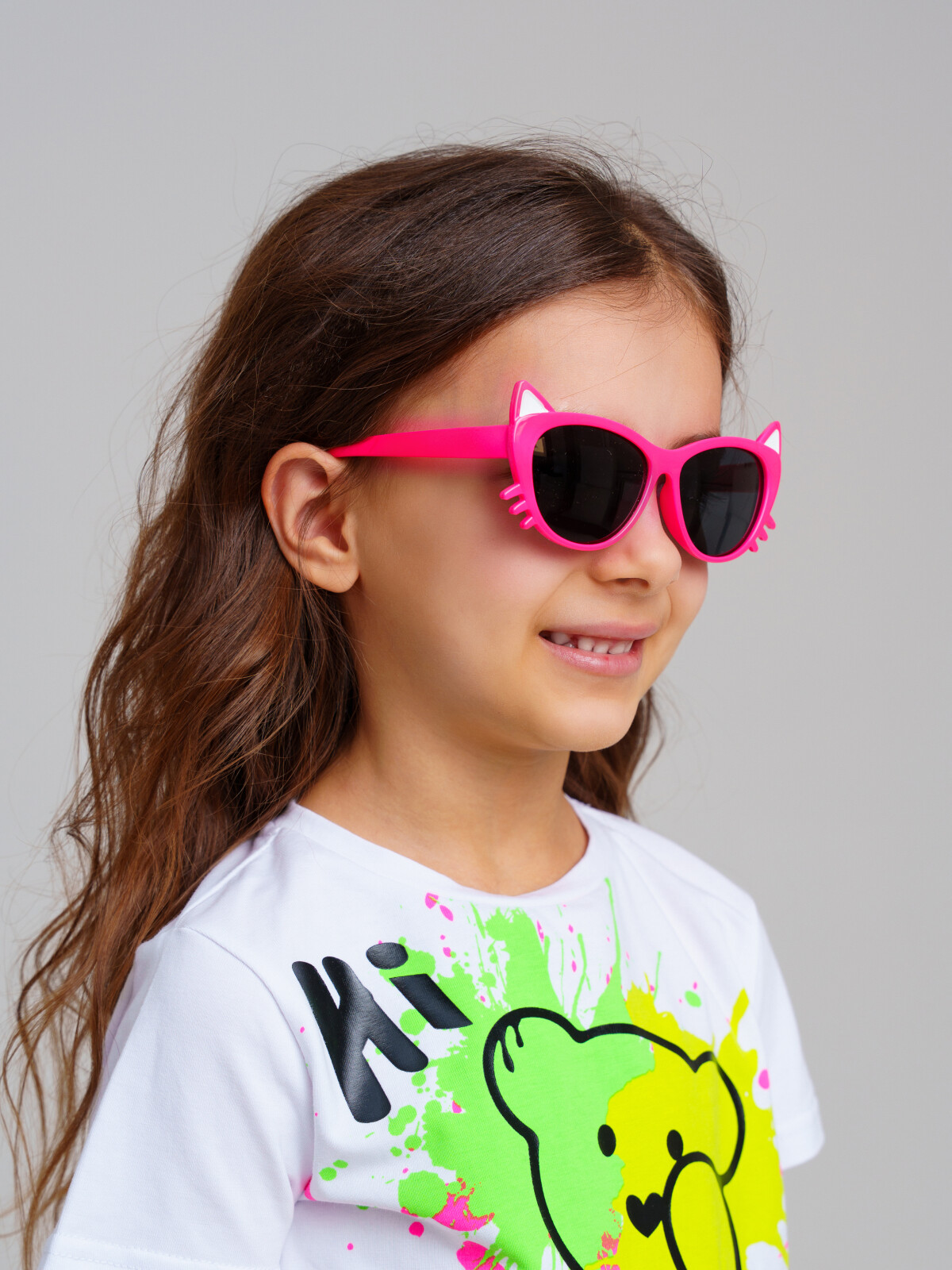 Очки в оправе кошечка - с ушками и усиками. Солнцезащитные очки с фильтром Cat3 детские для девочки. Поляризационные фильтры на очках поглощают блики, отражаемые от горизонтальных поверхностей, что помогает повысить четкость зрения и избежать напряжения глаз ребенка. Только при просмотре в линзах с поляризацией видны воздушные шарики в виде сердечек на тесте-вкладыше. Ширина оправы - 123мм, длина дужки - 124мм. Обхват головы 50-52см. Тёмные фильтры блокируют 85% солнечных лучей такие очки эффективны для защиты глаз в тропиках, у моря и в горах. Очки транспортируются в картонной коробке. В комплект входит фирменный текстильный чехол из микрофибры, с помощью которого легко ухаживать за изделием.