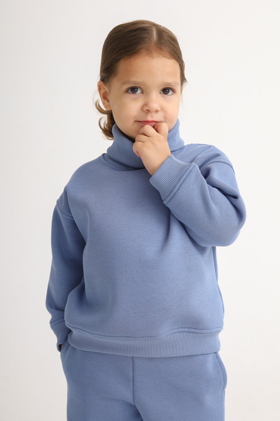 Объемный свитшот. Спущенная линия плеча. Высокий воротник-стойка с возможностью подворота. Манжеты на рукавах и по низу изделия - из кашкорсе