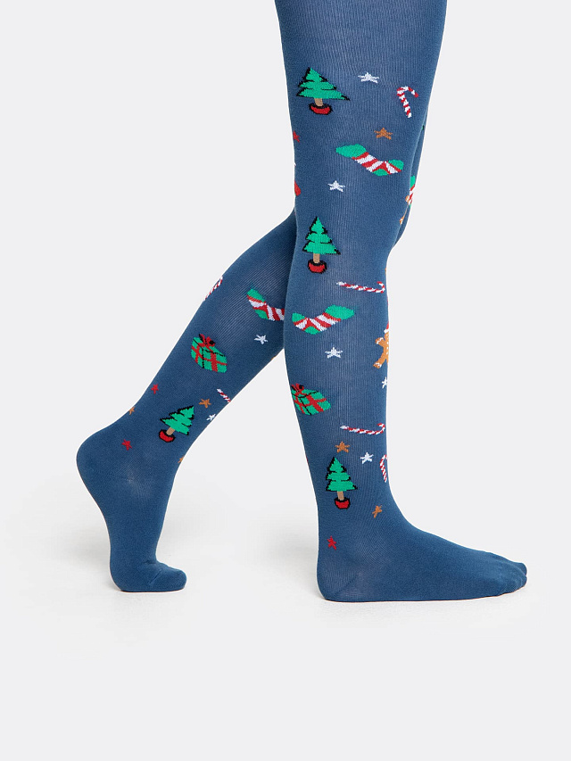 Колготки детские синие с рисунком в виде ёлок и печенья