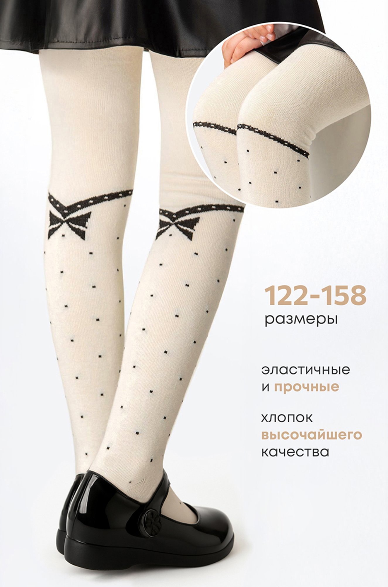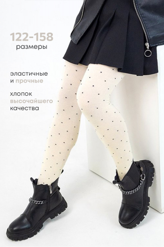 Модель Ксения, ее рост 120 см, параметры 55-54-66 см. На ней колготки 122 размера. отки кремового цвета с милым рисунком бантики и горошек для девочки и девочек подростков выполнены из хлопка с добавлением синтетических волокон.