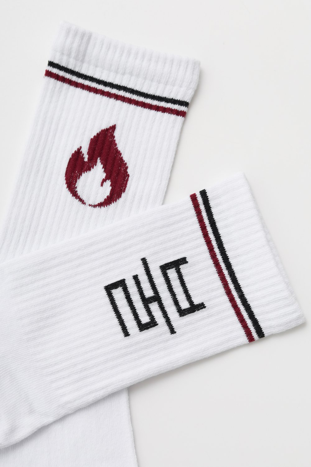 - яркий принт с надписью "огонь" на одном носке и рисунком на другом носке