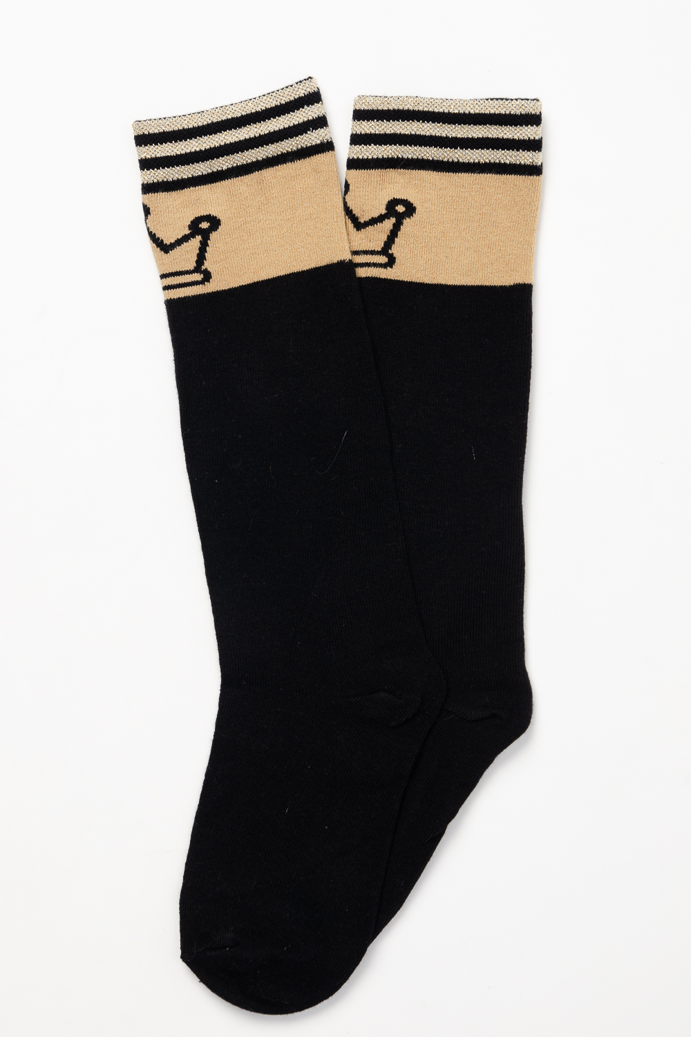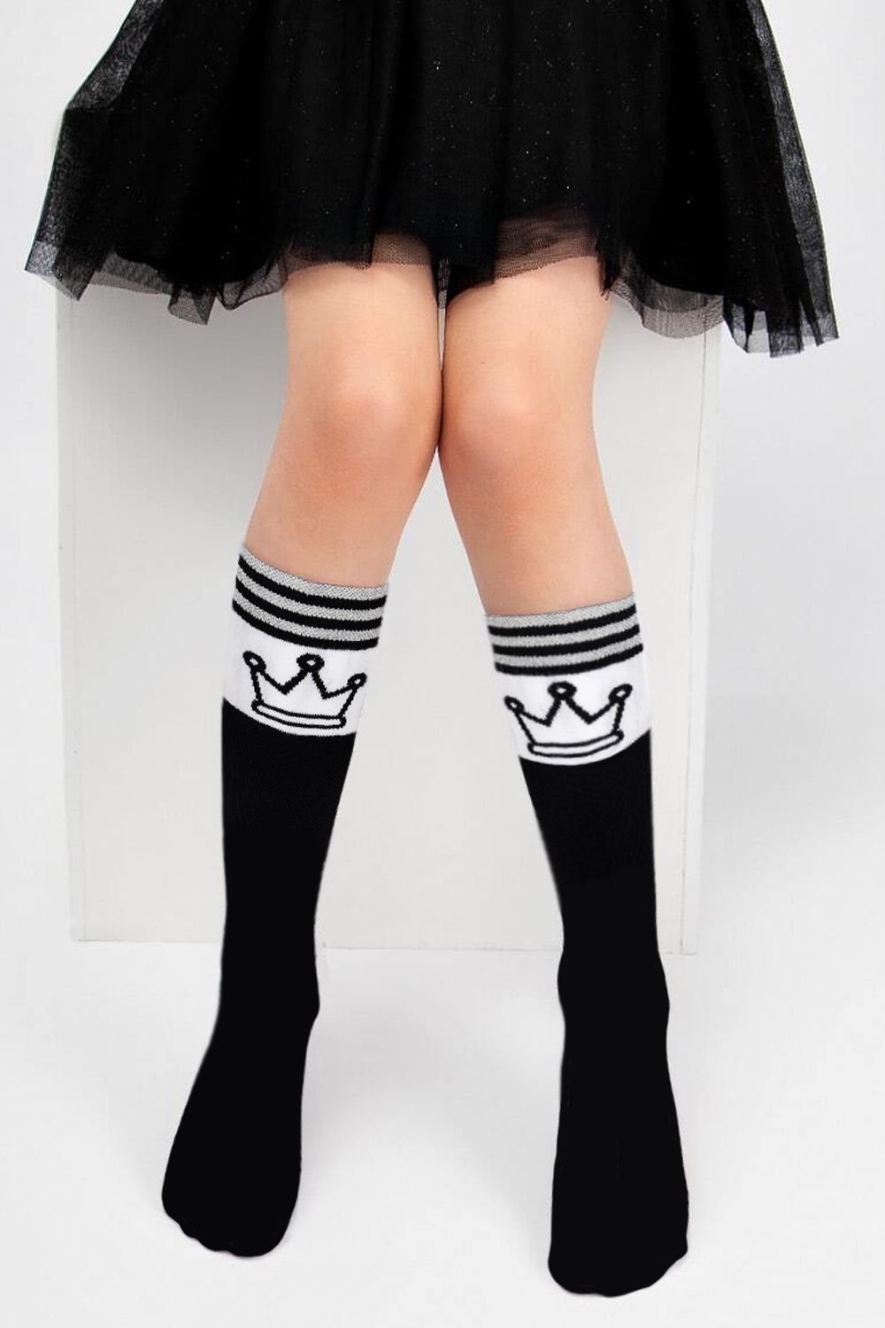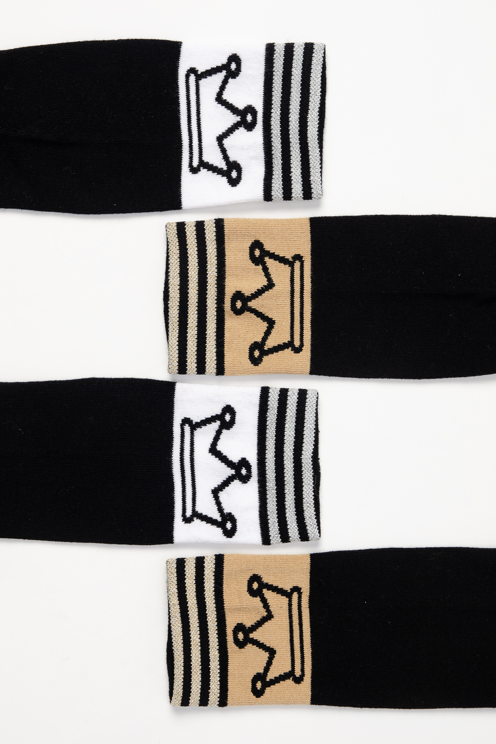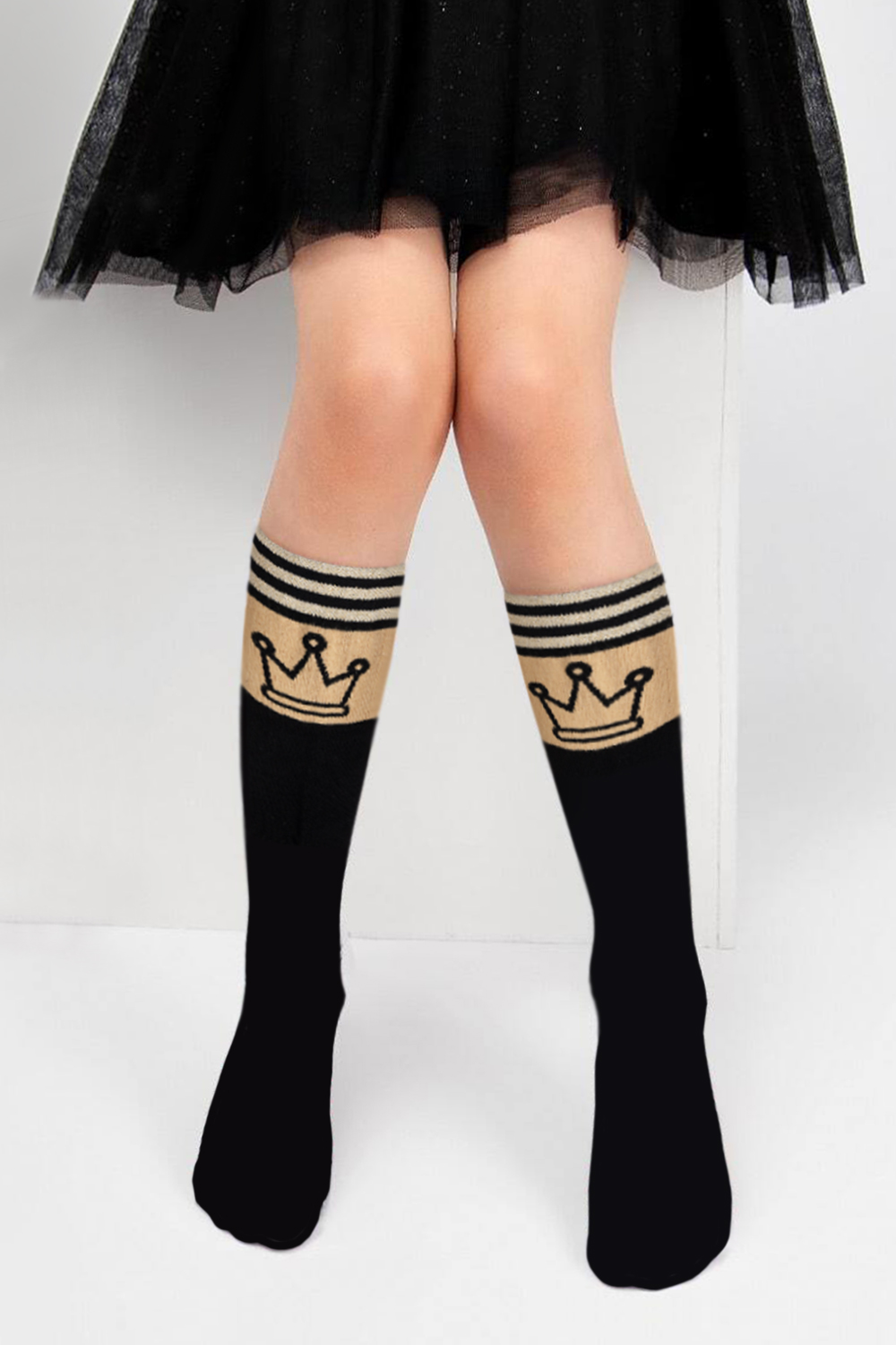 Стильные подростковые гольфы с лаконичным рисунком в виде короны и тонких полос с люрексом. Нарядные гольфы подойдут как для праздника, так и на каждый день. Расцветка: бежевый;бежевый,белый; Состав: 72% х/б 23% ПА 3% ПП 2% эластан.