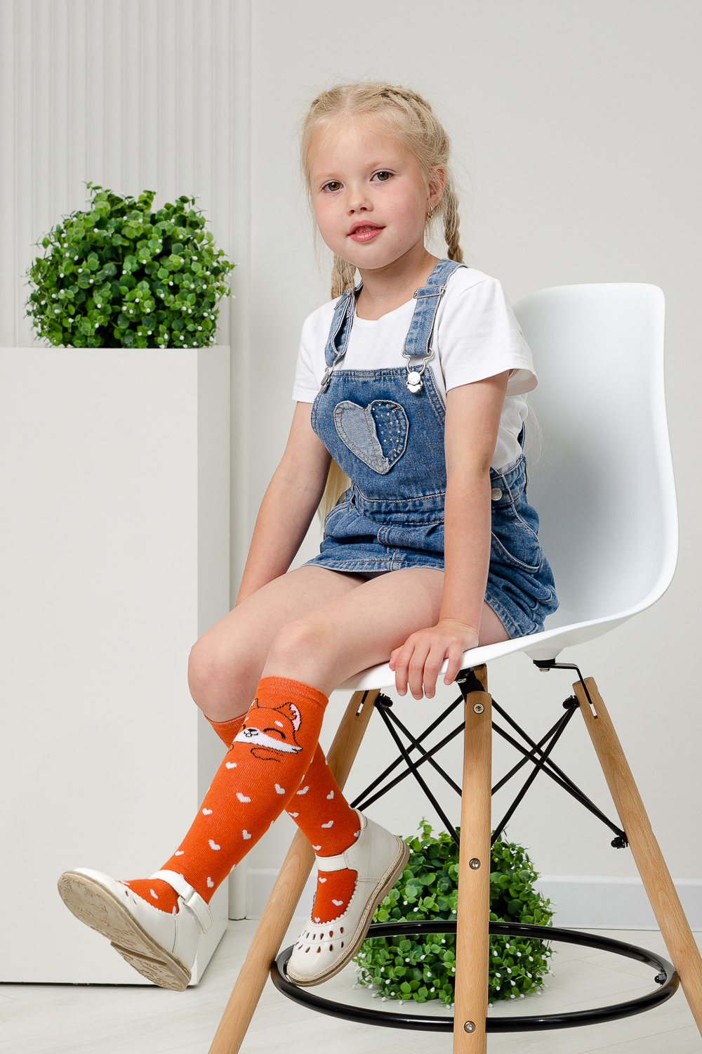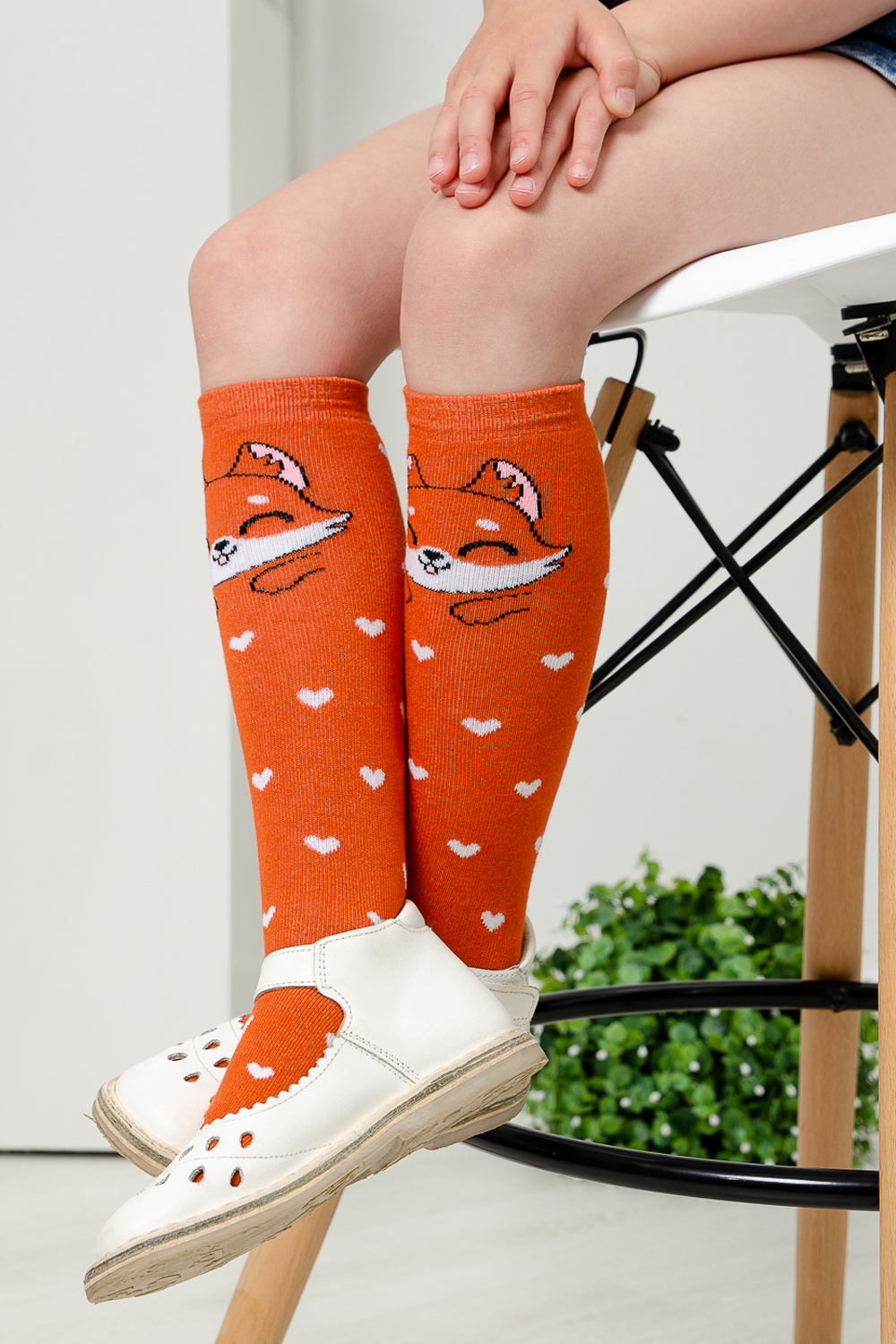 Забавные детские гольфы с узором из сердечек. На верхней части изображение лисенка. В комплекте 2 пары Расцветка: рыжий, коралл (ед.); Состав: 74% х/б 21% ПА 3% ПП 2% эластан.