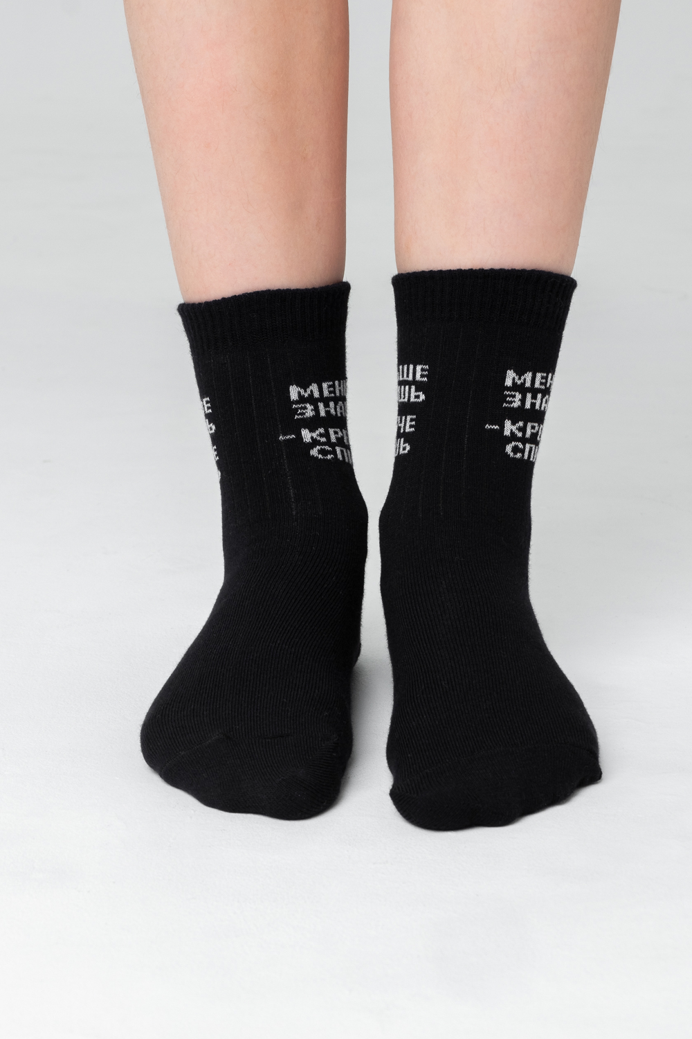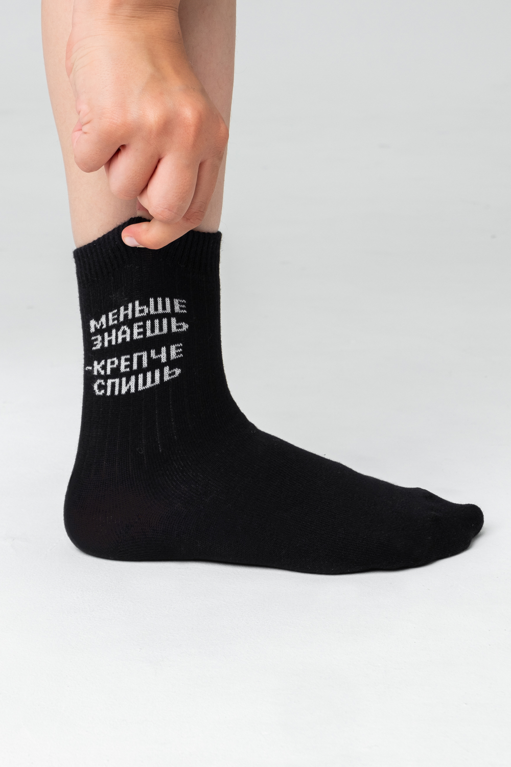 Подростковые носочки с надписью "Меньше знаешь - крепче спишь", связанные из натурального  хлопка. Креативная модель мягко облегает ногу, не доставляя дискомфорт в течение всего дня. Носки сочетаются с разной обувью, подходят как мальчикам, так и девочкам. Расцветка: черный (ед.); Состав: 77% х/б 21% ПА 2% эластан.