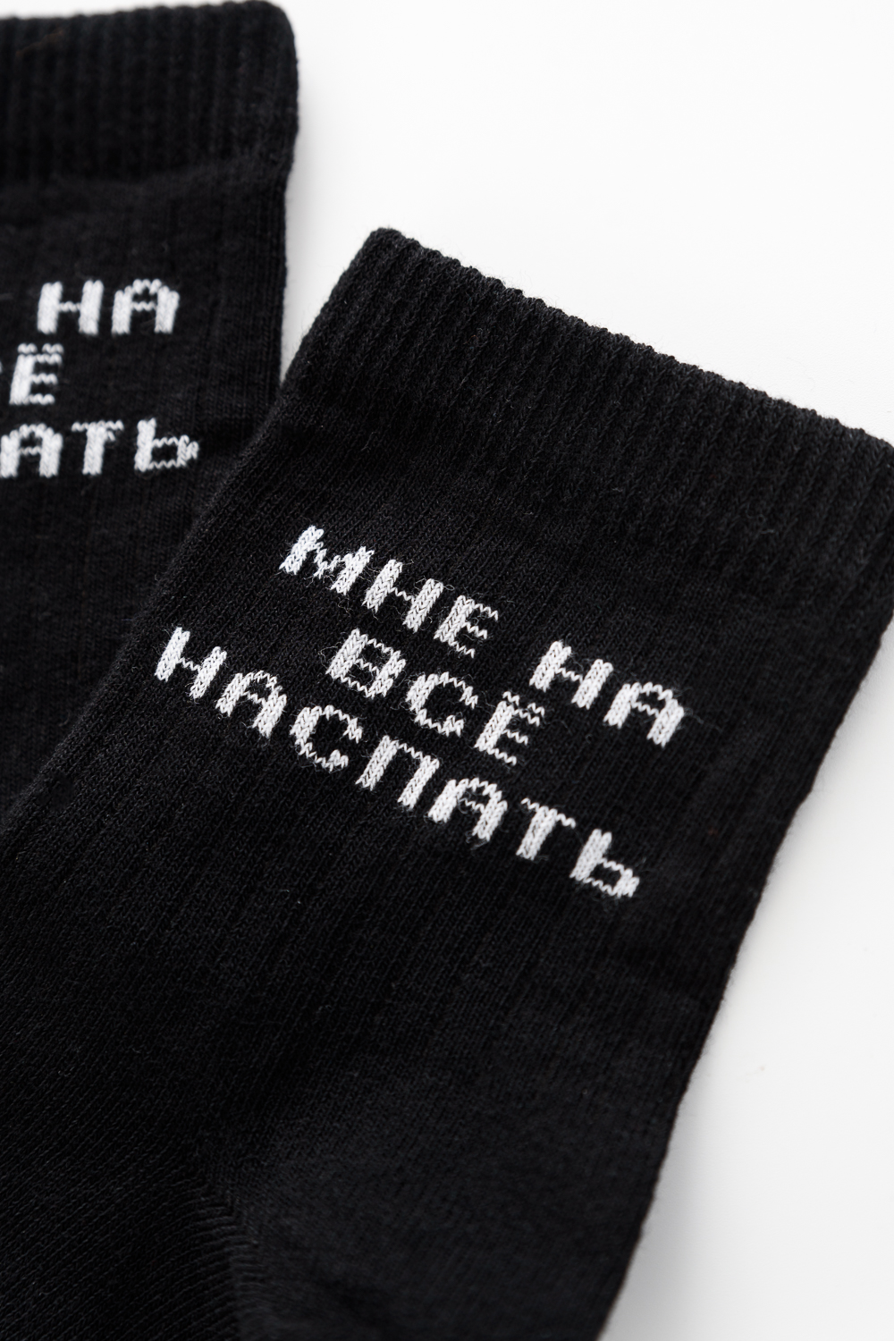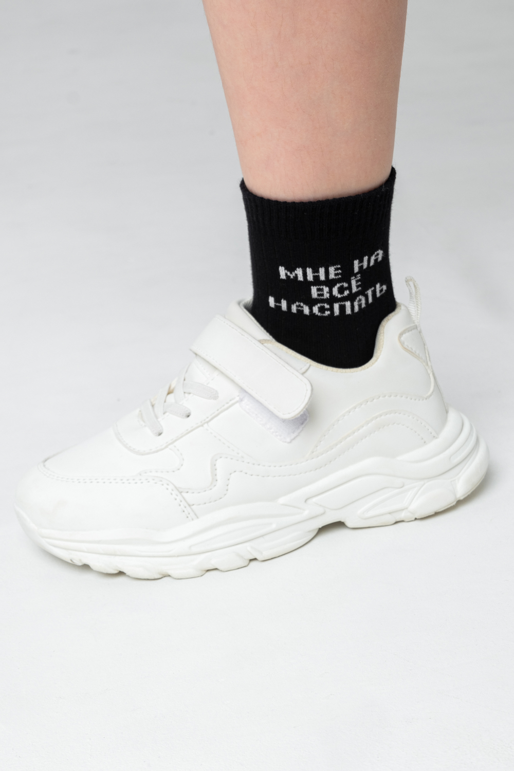 Подростковые носочки с надписью "На все-наспать", связанные из натурального  хлопка. Креативная модель мягко облегает ногу, не доставляя дискомфорт в течение всего дня. Носки сочетаются с разной обувью, подходят как мальчикам, так и девочкам. Расцветка: черный (ед.); Состав: 77% х/б 21% ПА 2% эластан.