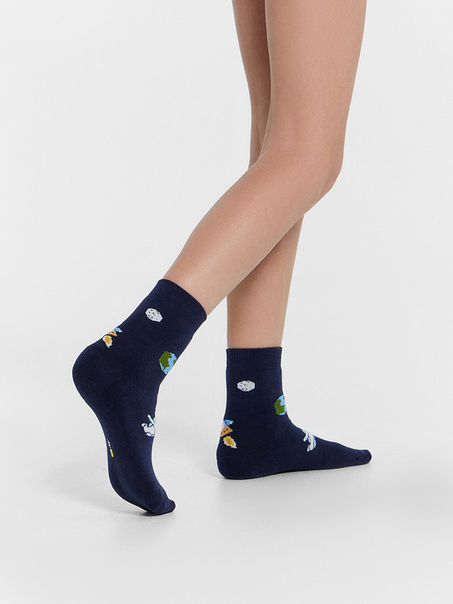 Носки детские плюшевые в темно-синем цвете с рисунком в виде космонавтов