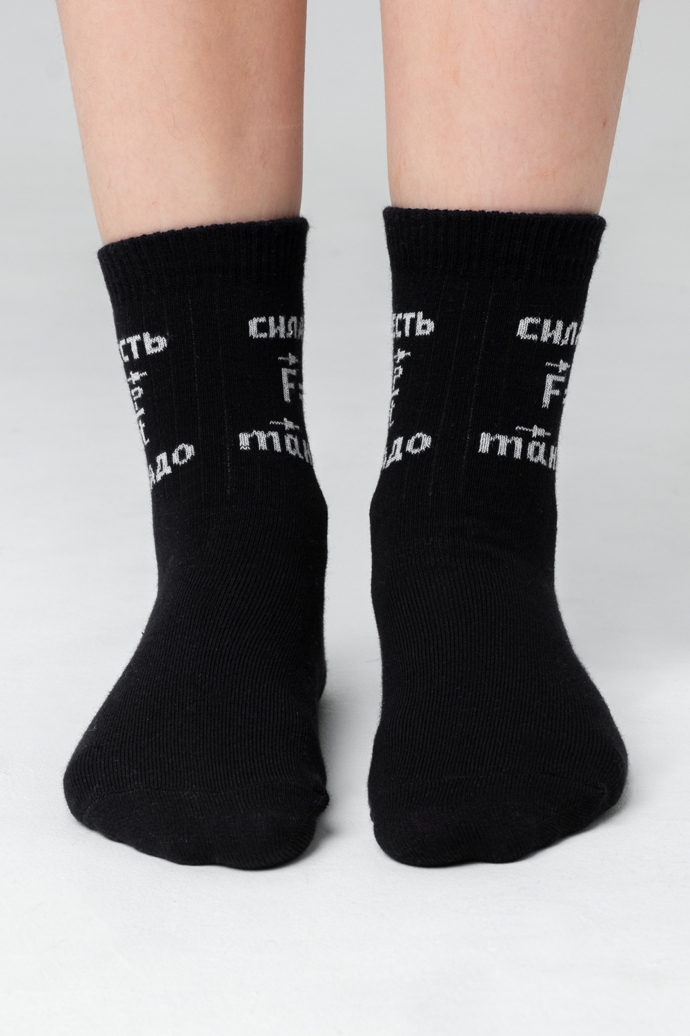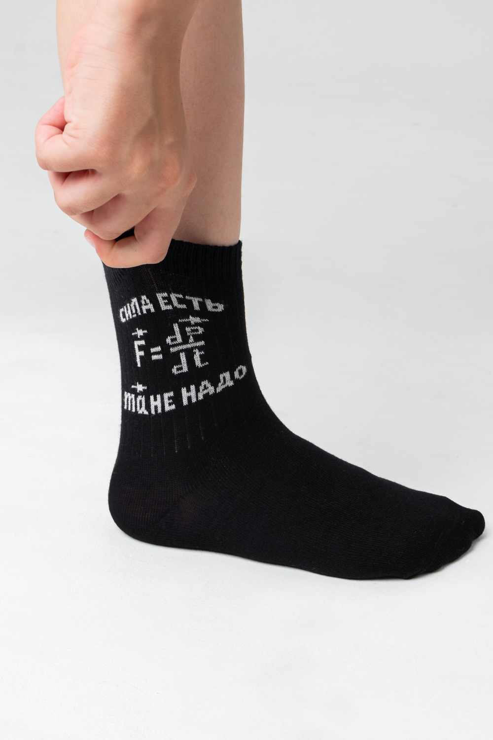 Подростковые носочки с креативной надписью, связанные из натурального  хлопка. Креативная модель мягко облегает ногу, не доставляя дискомфорт в течение всего дня. Носки сочетаются с разной обувью, подходят как мальчикам, так и девочкам. Расцветка: черный (ед.); Состав: 77% х/б 21% ПА 2% эластан.