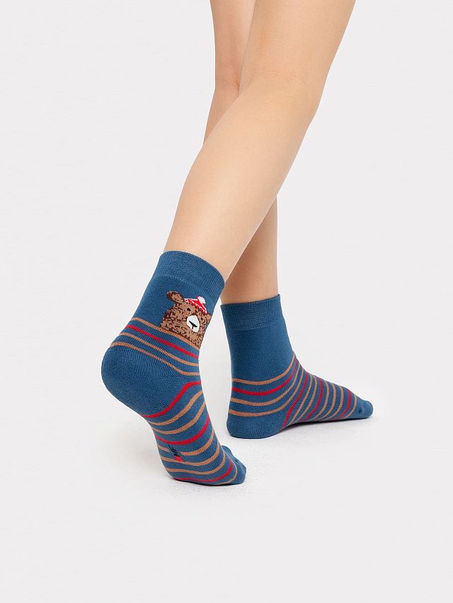 Носки детские синие махровые с рисунком в виде медведя и полосок