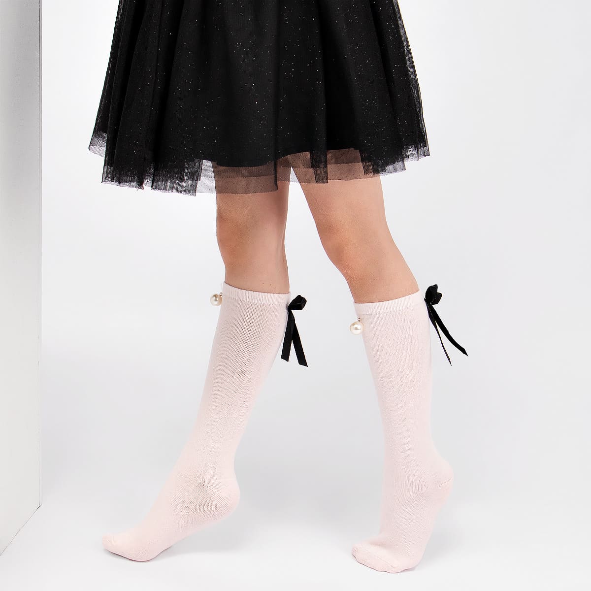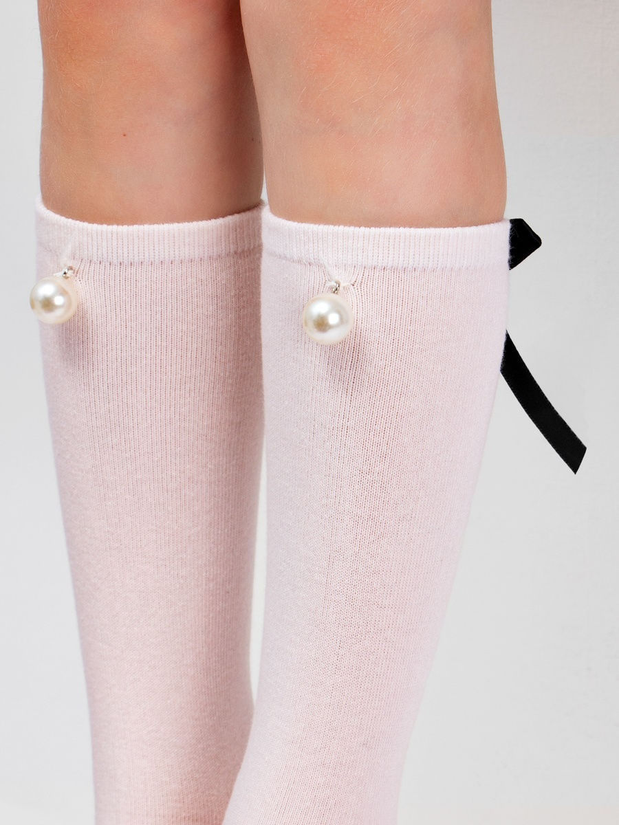 Фантазийные гольфы из натурального материала, декорированные жемчугом и бантиком.