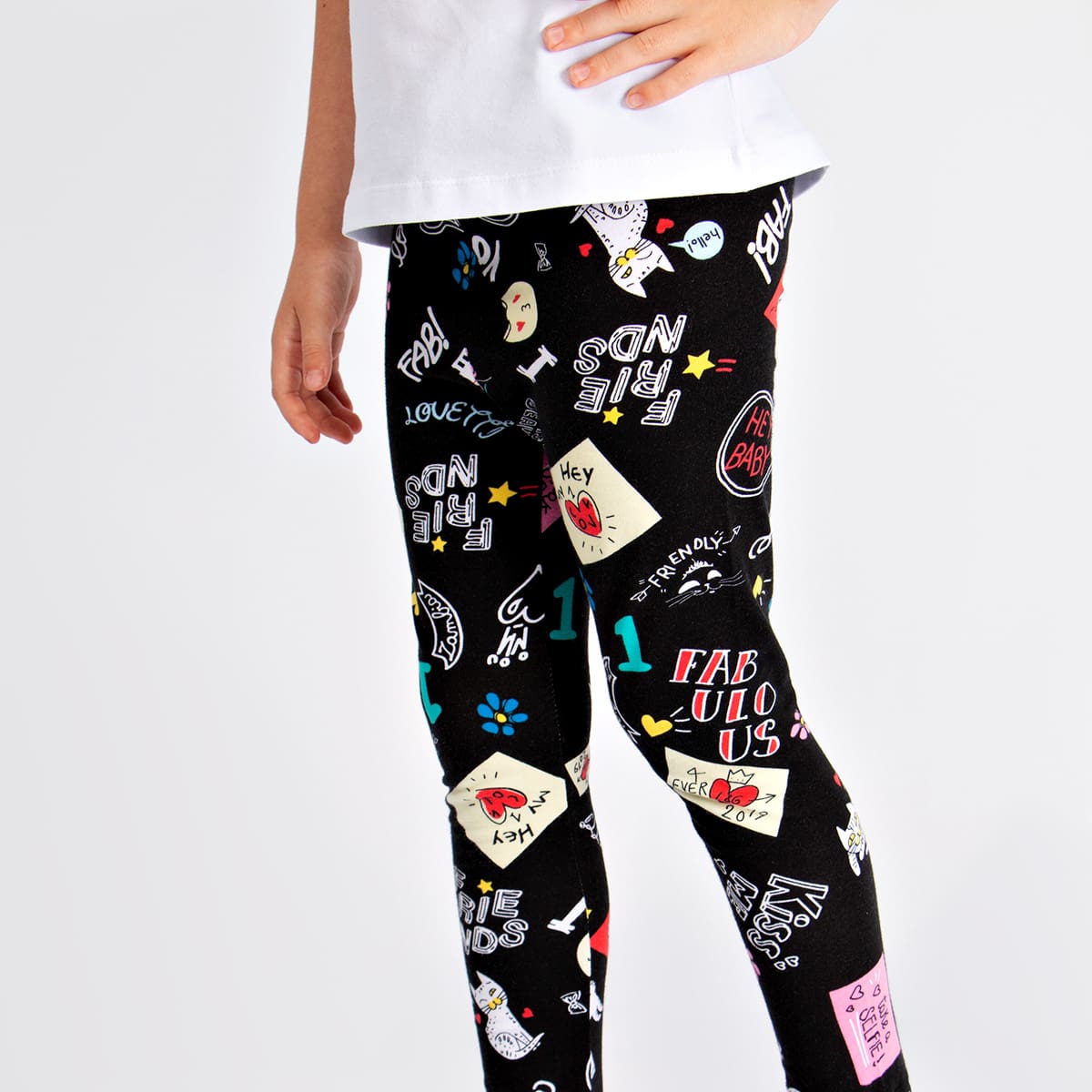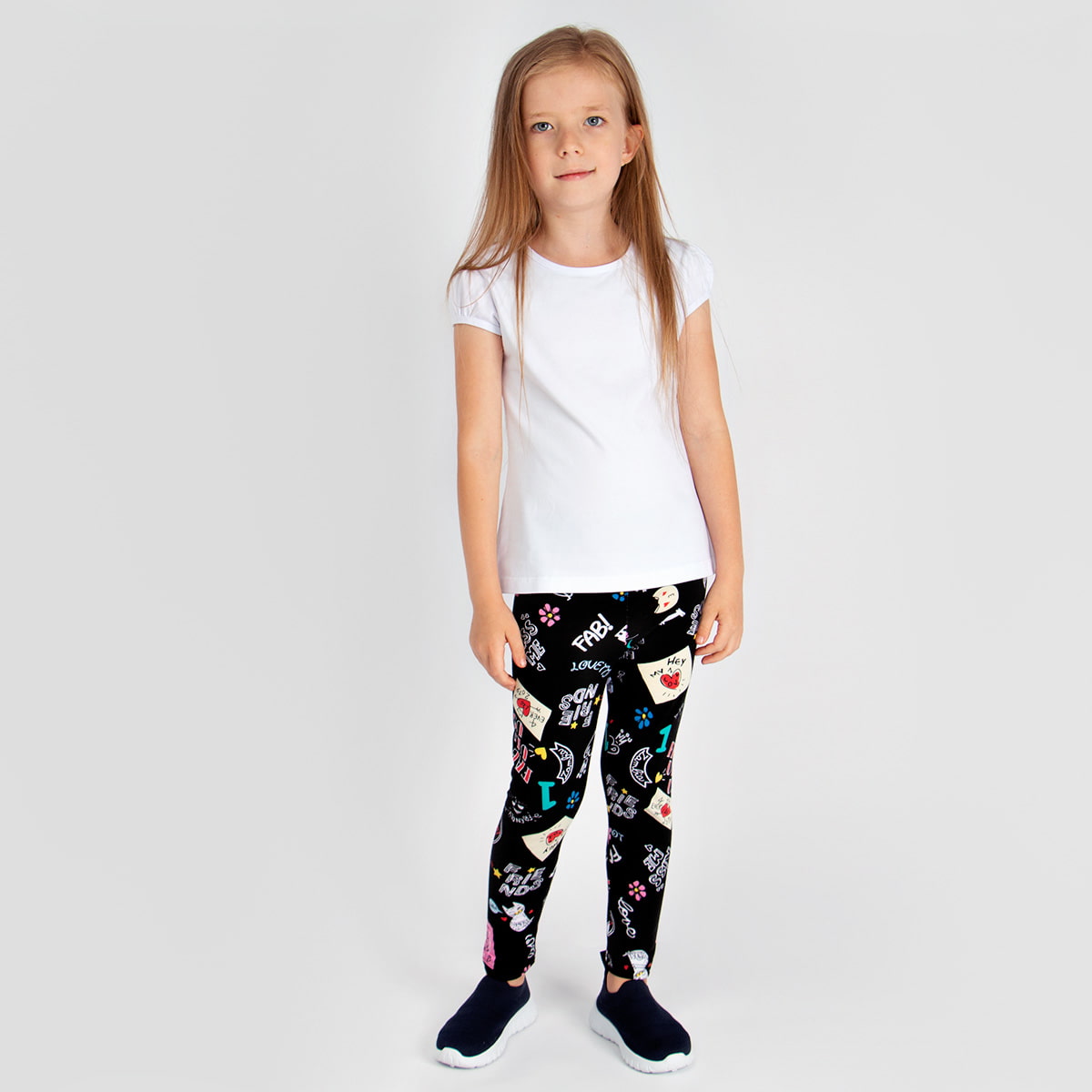 Комфортные трикотажные лосины для девочки. Сочетание интересных, ярких принтов по всей поверхности изделия, пояс на широкой внутренней резинке.