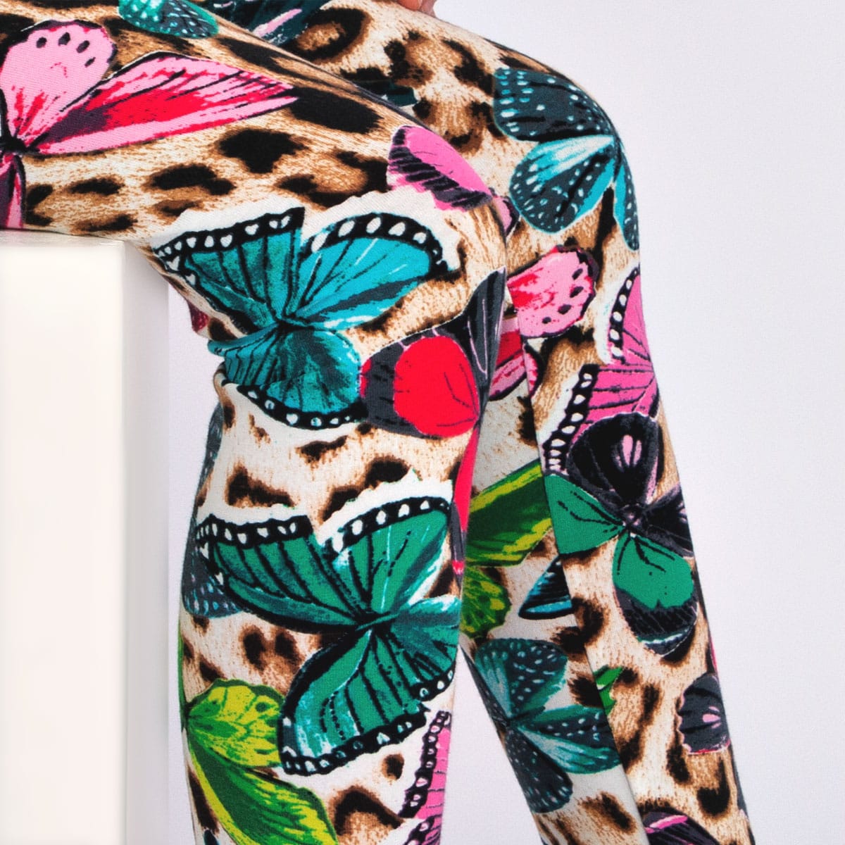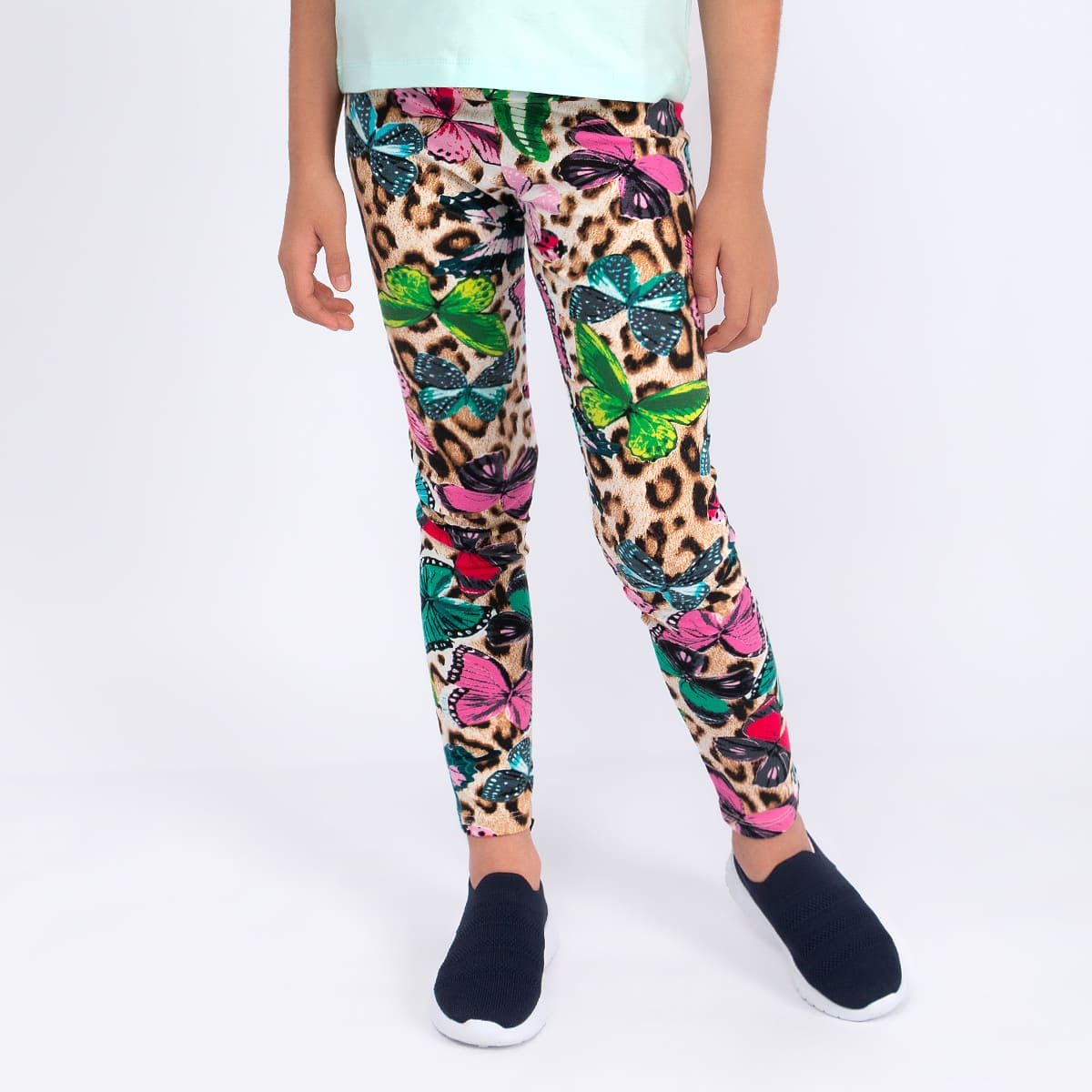 Комфортные трикотажные лосины для девочки. Яркий анималистичный принт по всей поверхности изделия, пояс на широкой внутренней резинке.