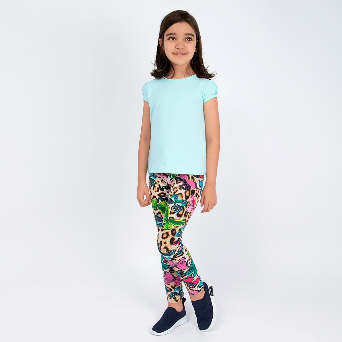 Комфортные трикотажные лосины для девочки. Яркий анималистичный принт по всей поверхности изделия, пояс на широкой внутренней резинке.