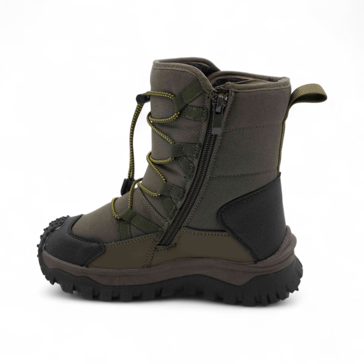 Материал: Верх обуви выполнен из непромокаемого текстиля, что обеспечивает надежную защиту от снега и влаги. Вставки из эко-кожи дополнительно защищают мысок и пятку сапожек от механических повреждений. Подкладка и стелька из искусственного меха, которая обладает отличными теплоизоляционными свойствами.