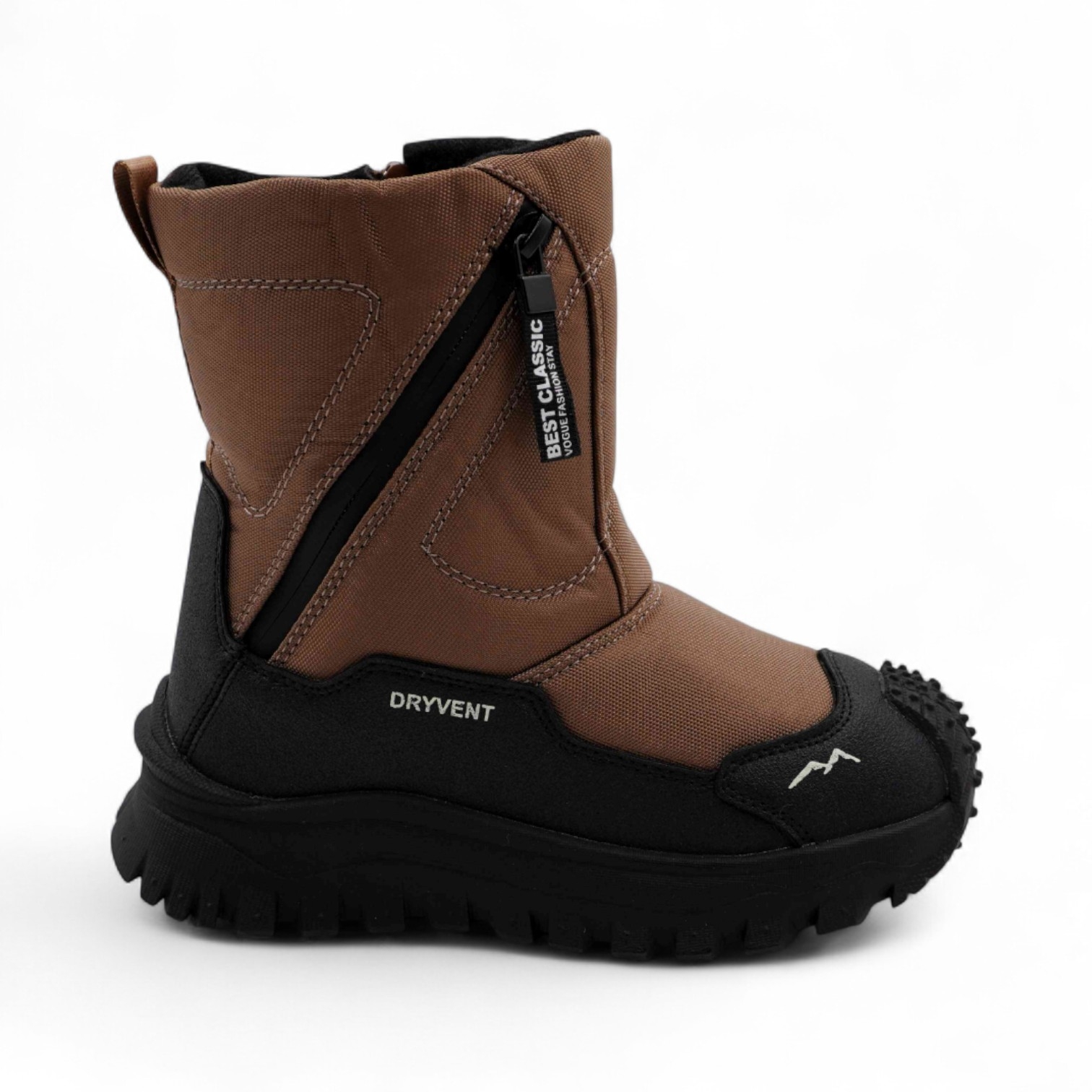 Материал: Верх обуви выполнен из непромокаемого текстиля, что обеспечивает надежную защиту от снега и влаги. Вставки из эко-кожи дополнительно защищают мысок и пятку сапожек от механических повреждений. Подкладка и стелька из искусственного меха, которая обладает отличными теплоизоляционными свойствами.