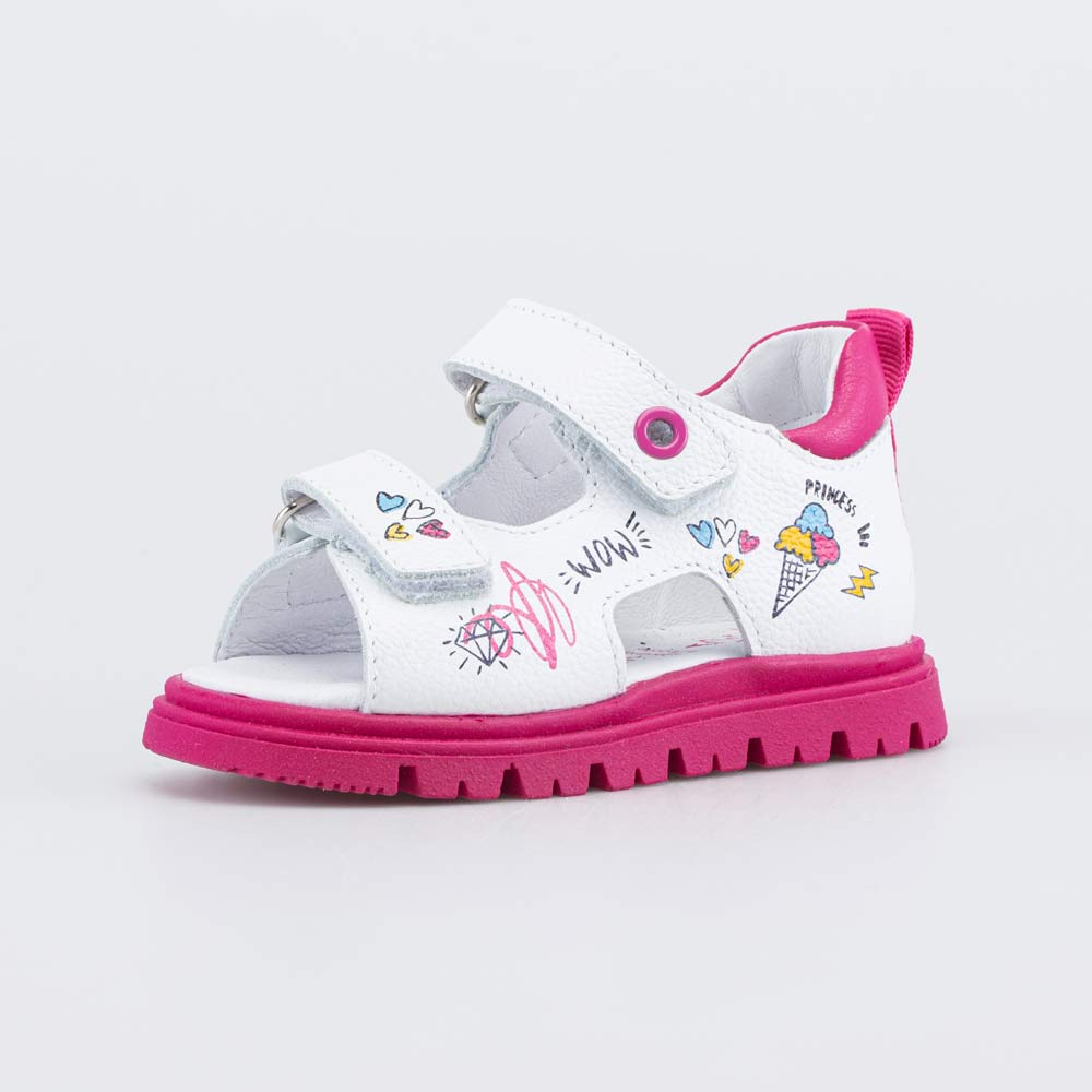 Детские сандалии имеют верх, подкладку и стельку из натуральной кожи белого цвета, что обеспечивает гигиенические свойства и защищает носочки от окрашивания. Летний принт и насыщенные цветовые акценты поднимают настроение.