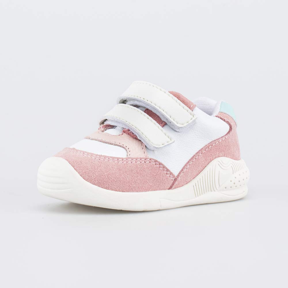 Верх изготовлен из сочетания натуральной гладкой кожи и кожи-велюра розового цвета. Подкладка из хлопка и съемная кожаная стелька создают внутри оптимальный микроклимат, позволяют ножкам дышать и отводят от них влагу. Формованная основа стельки мягко поддерживает стопу.