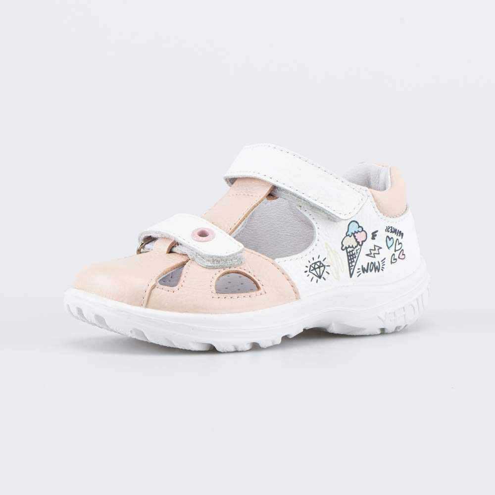 Детские сандалии имеют верх, подкладку и съемную стельку из натуральной кожи – гипоаллергенного и дышащего материала, который обеспечивает высокие гигиенические свойства. Летний принт поднимает настроение.