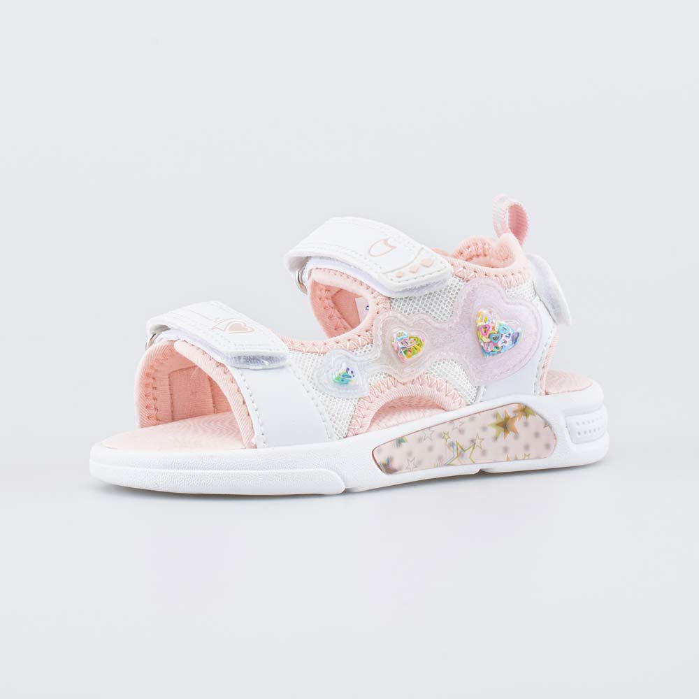 Верх летних сандалий выполнен из сочетания текстиля и искусственной кожи и украшен перламутровыми вставками и сердечками с глиттером.