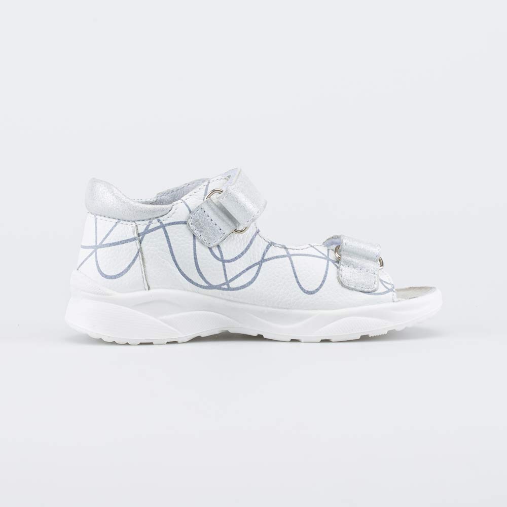 Детские сандалии имеют верх из натуральной кожи голубого цвета и украшены волнистым узором. Подкладка и несъемная стелька из белой натуральной кожи обеспечивают гигиенические свойства и защищают носочки от окрашивания.