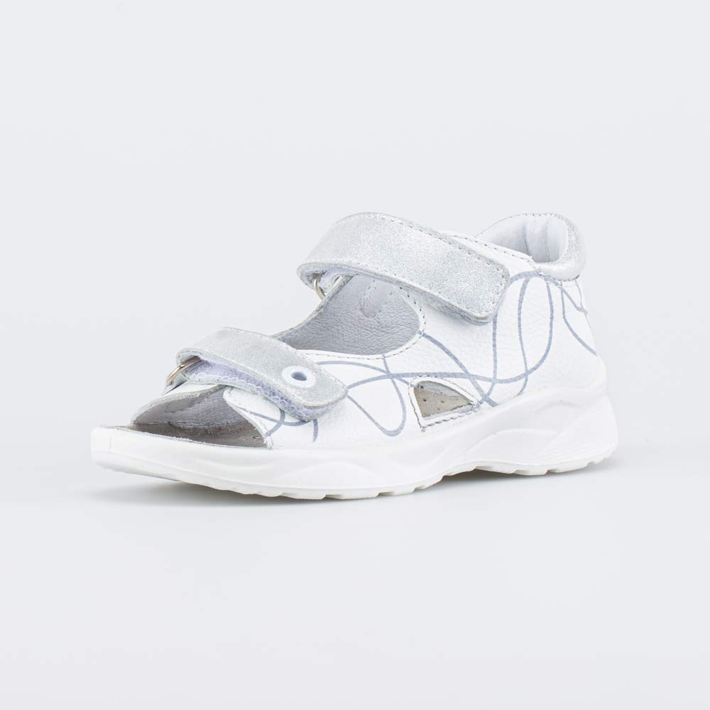 Детские сандалии имеют верх из натуральной кожи голубого цвета и украшены волнистым узором. Подкладка и несъемная стелька из белой натуральной кожи обеспечивают гигиенические свойства и защищают носочки от окрашивания.