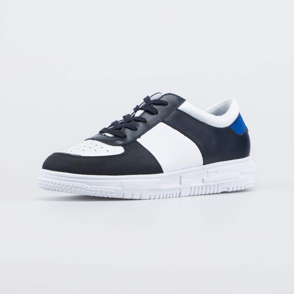 Полуботинки, выполненные в сочетании черного, белого и синего цветов, можно сочетать с разными образами.