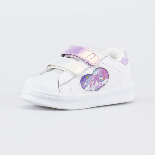 Подошва из легкого и амортизирующего материала ЭВА оснащена светодиодами, которые срабатывают от ударной нагрузки. Дополнительную изюминку придает принт, изображающий крылатого единорога.