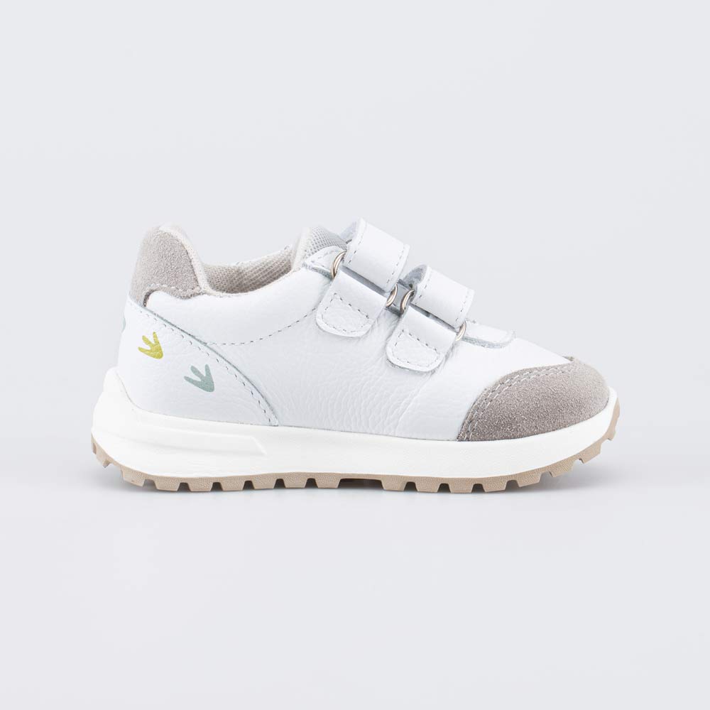 Верх выполнен из натуральной кожи белого цвета и украшен веселым принтом. Натуральный велюр на носочной части, за которым легко ухаживать, помогает сохранять аккуратный вид обуви. В меру жесткий задник надежно поддерживает пяточку при ходьбе, а мягкий манжет дарит комфорт.