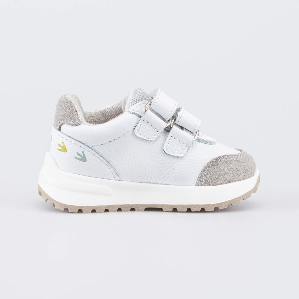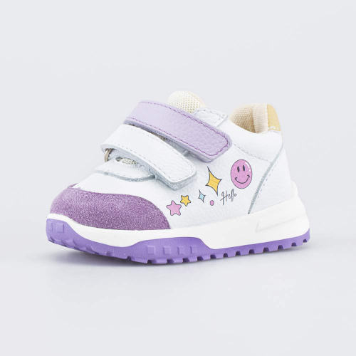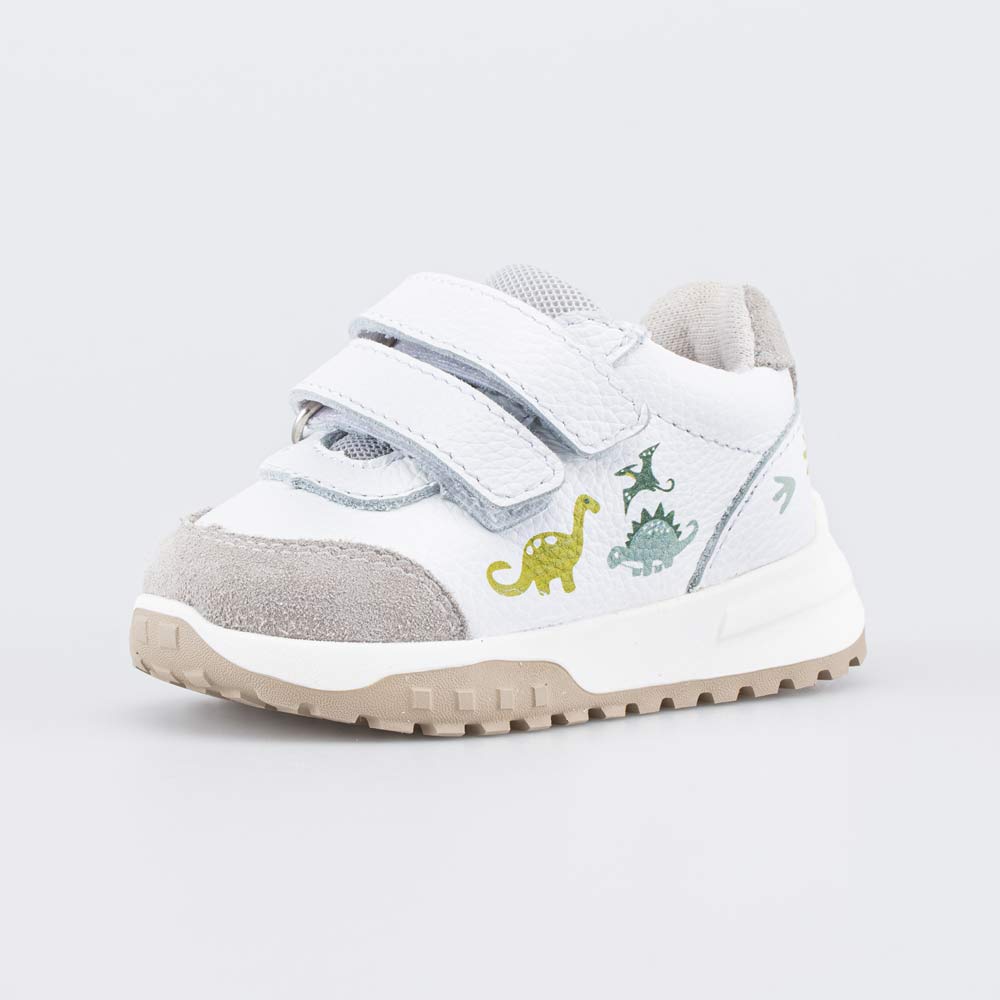 Верх выполнен из натуральной кожи белого цвета и украшен веселым принтом. Натуральный велюр на носочной части, за которым легко ухаживать, помогает сохранять аккуратный вид обуви. В меру жесткий задник надежно поддерживает пяточку при ходьбе, а мягкий манжет дарит комфорт.