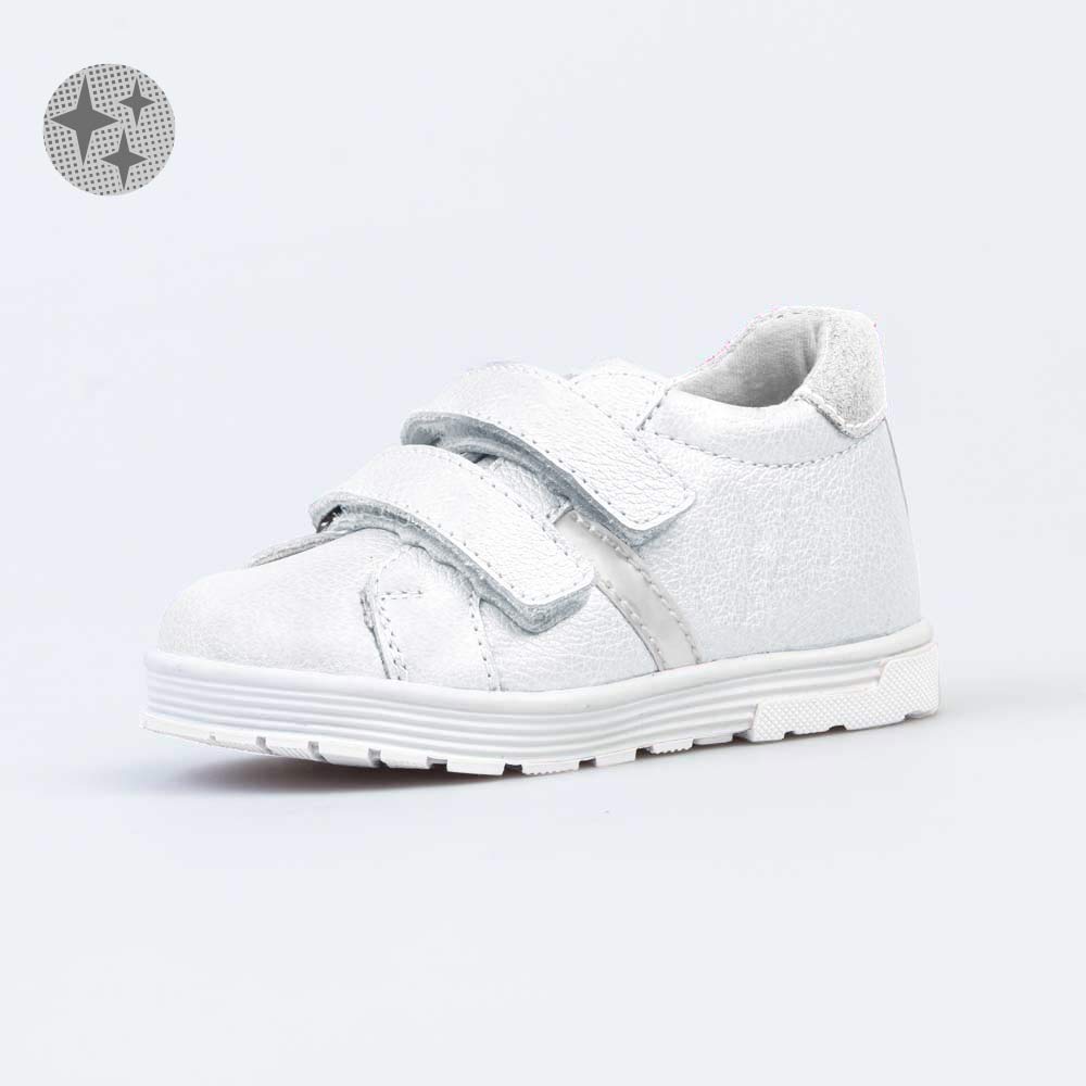 Верх, подкладка и стелька выполнены из 100% натуральной кожи белого цвета с эффектом серебристого блеска.