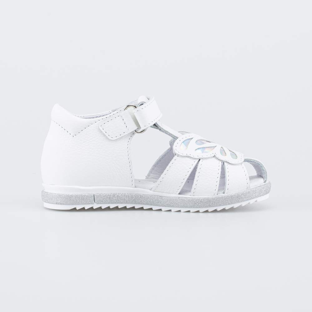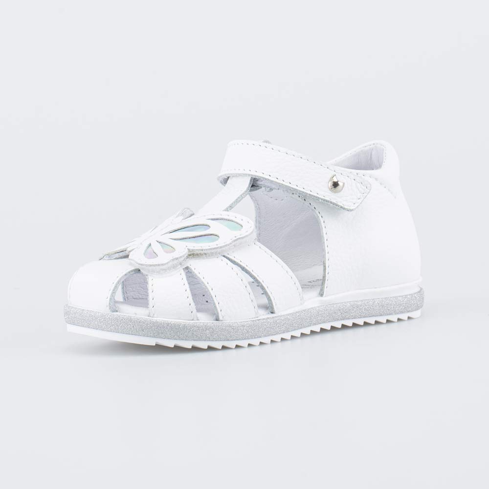 Детские сандалии имеют верх, подкладку и несъемную стельку из натуральной кожи – гипоаллергенного и дышащего материала, который обеспечивает высокие гигиенические свойства. Модель украшена объемной бабочкой.
