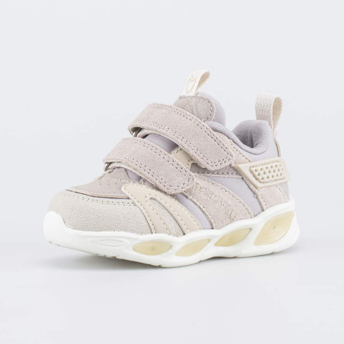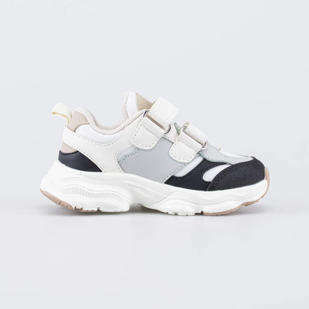 Детские кроссовки выполнены в трендовом бежевом цвете с контрастными черными акцентами и подходят для мальчика, который уже начал активно ходить.