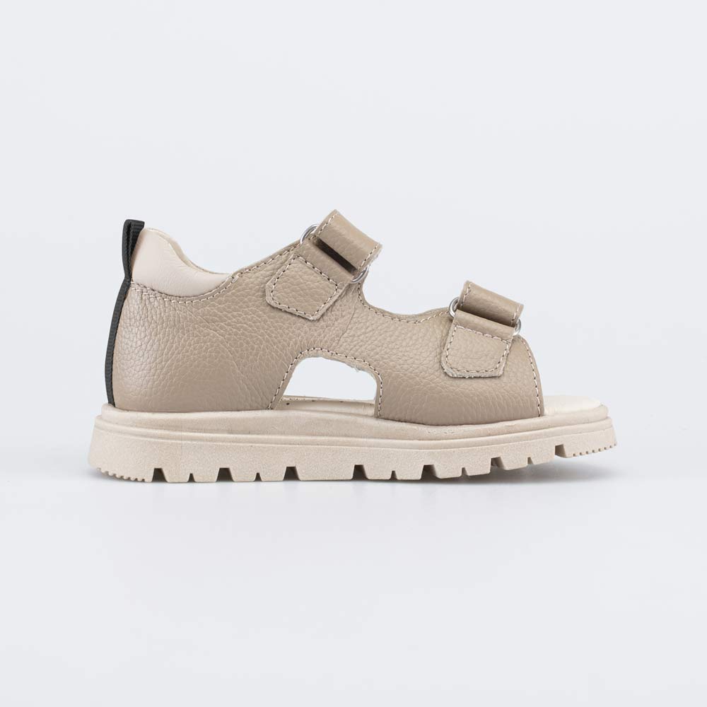 Бежевые сандалии, украшенные принтом, подходят для мальчика, который только начинает ходить.