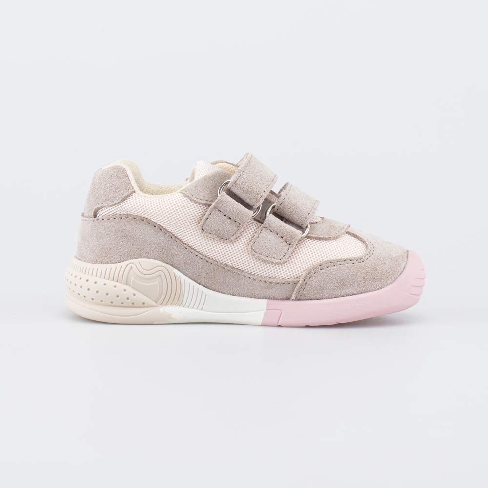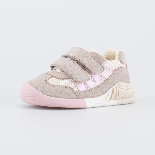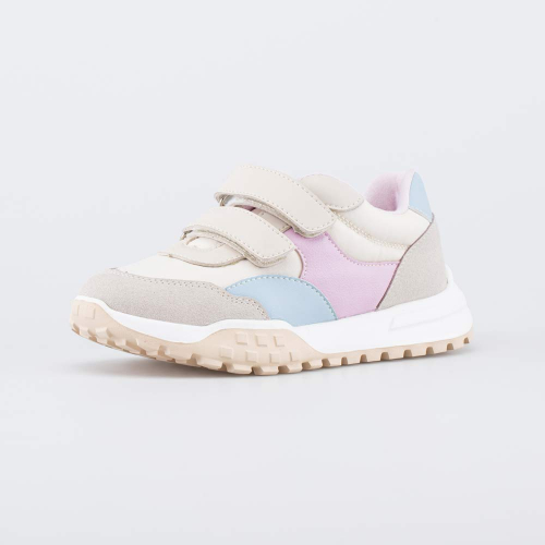 Детские кроссовки, выполненные в сочетании трендовых цветов (бежевого и розового), подходят для девочки, которая уже начала активно ходить.