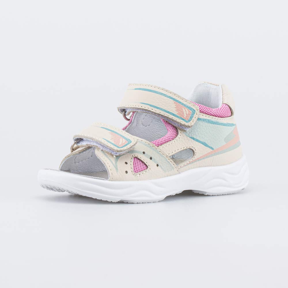 Детские сандалии имеют верх из натуральной кожи, которая дополнена дышащим текстилем в сеточку. Подкладка и несъемная стелька из белой натуральной кожи обеспечивают гигиенические свойства и защищают носочки от окрашивания.