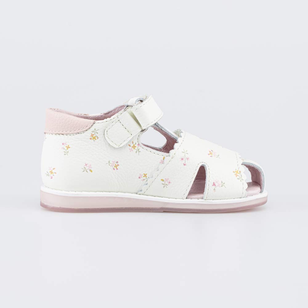 Верх изготовлен из натуральной кожи бежевого цвета и украшен принтом в виде полевых цветов. Подкладка и несъемная стелька также выполнены из натуральной кожи, что обеспечивает оптимальный микроклимат внутри детской обуви.