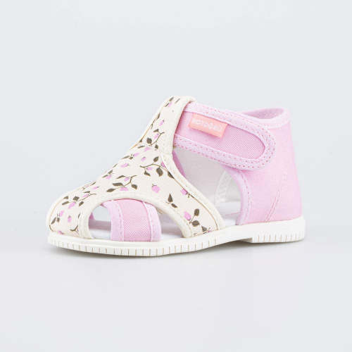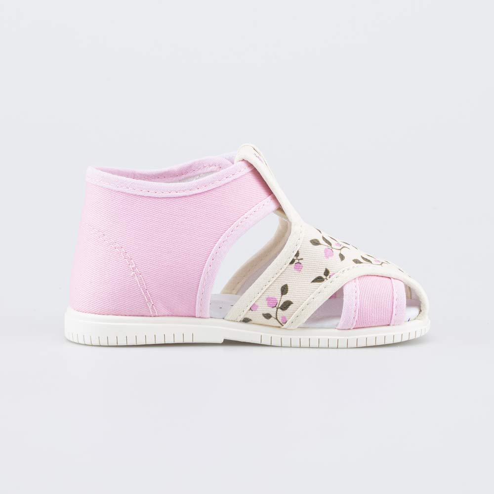 Текстильные сандалии, украшенные милым ягодным принтом, подходят для девочки ясельного возраста.