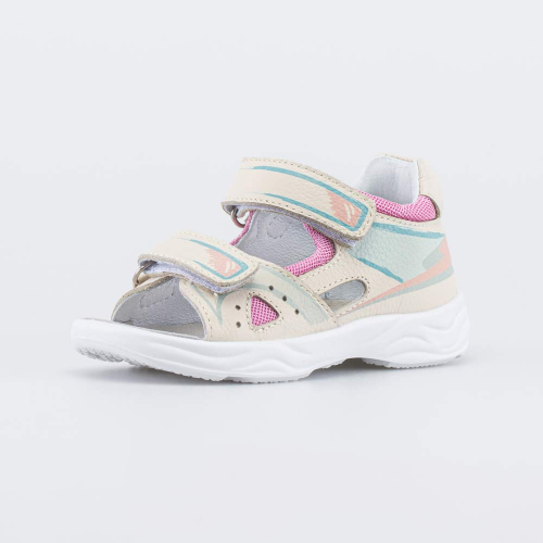 Детские сандалии имеют верх из натуральной кожи, которая дополнена дышащим текстилем в сеточку. Подкладка и несъемная стелька из белой натуральной кожи обеспечивают гигиенические свойства и защищают носочки от окрашивания.