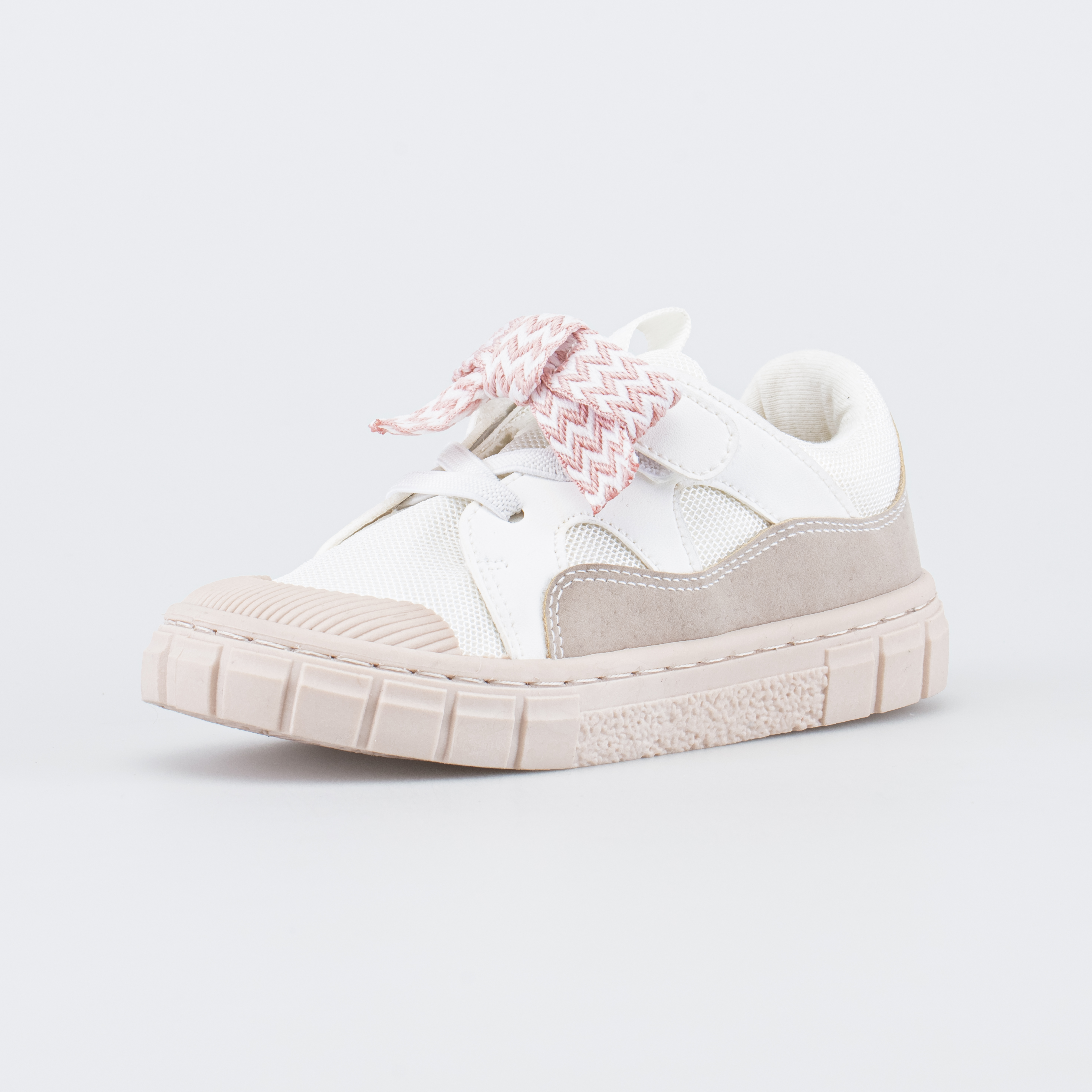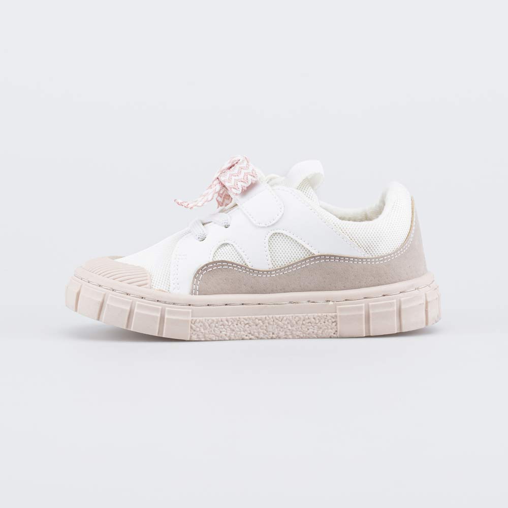 Эти бежевые кеды имеют верх из сочетания искусственной кожи и плотного сетчатого материала, который обеспечивает высокую воздухопроницаемость детской обуви. Подкладка из натурального хлопка делает детские кеды достаточно плотными, чтобы носить их в осенне-весенний сезон. Формованная основа съемной хлопковой стельки амортизирует и поддерживает стопу.