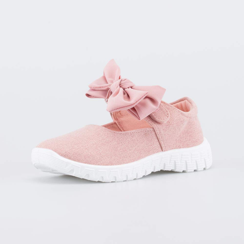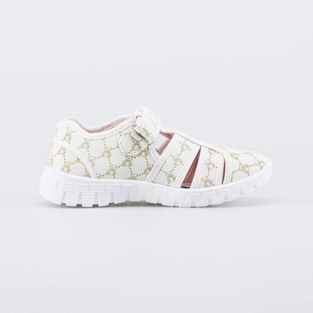Бежевые текстильные туфли для девочки, по всей поверхности украшенные принтом, подходят для жарких дней и повседневного использования в детском саду.