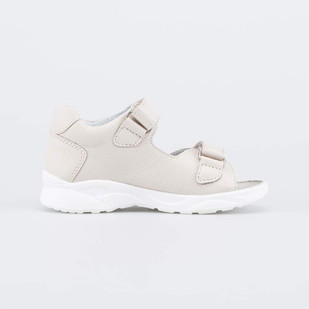 Детские сандалии имеют верх из натуральной кожи бежевого цвета. Подкладка и несъемная стелька из белой натуральной кожи обеспечивают гигиенические свойства и защищают носочки от окрашивания.
