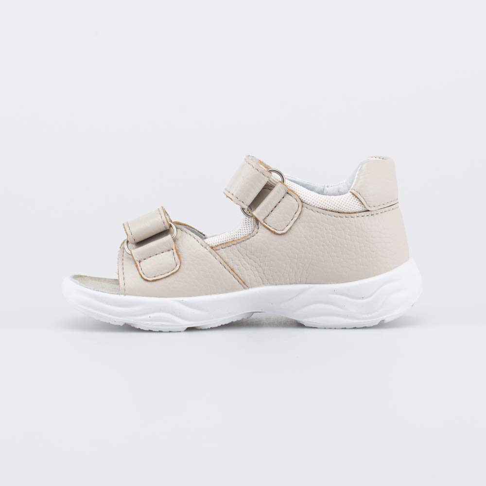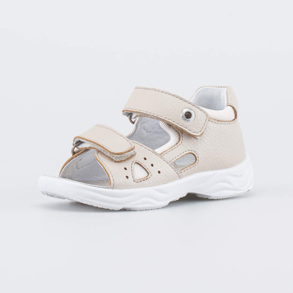 Детские сандалии имеют верх из натуральной кожи бежевого цвета, который дополнен дышащим текстилем в сеточку. Подкладка и несъемная стелька из белой натуральной кожи обеспечивают гигиенические свойства и защищают носочки от окрашивания.