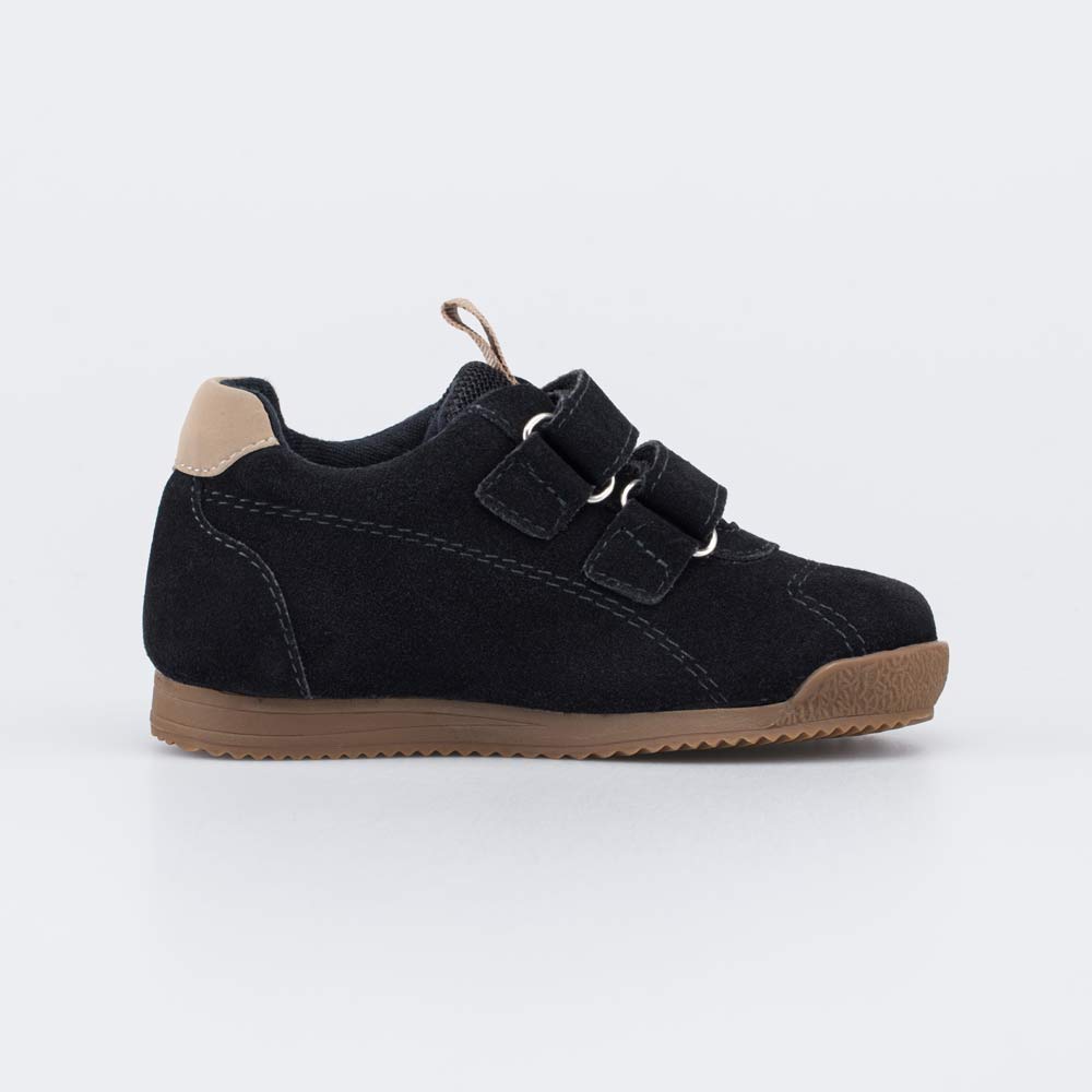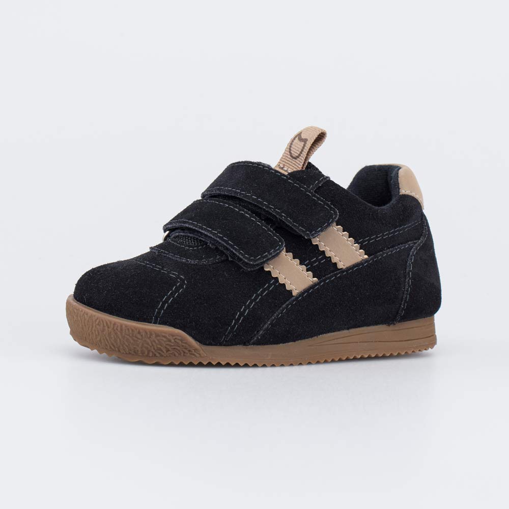 Верх этих черных кроссовок выполнен из гипоаллергенной и дышащей натуральной кожи-велюра и дополнен контрастными бежевыми деталями. Текстильный язычок из сетчатого материала повышает воздухопроницаемость детской обуви.